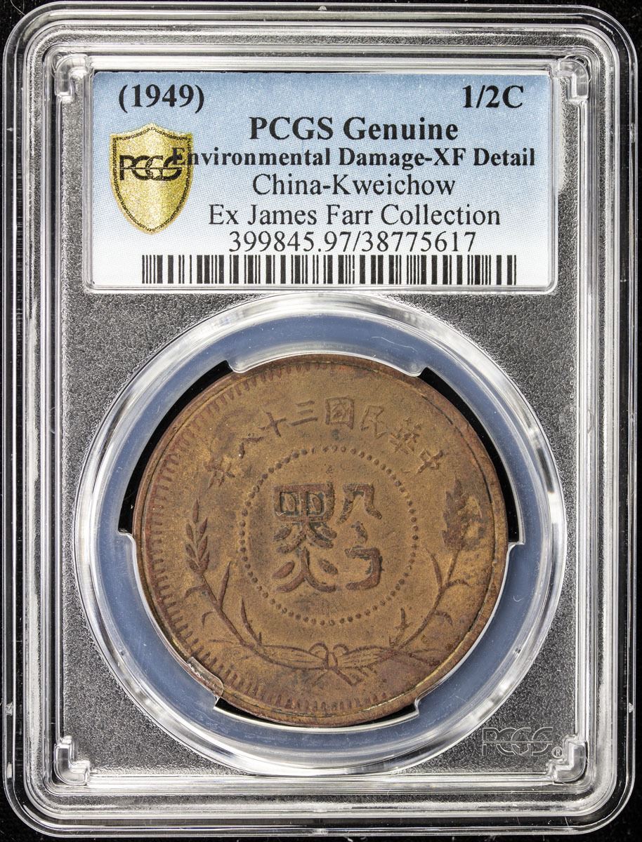 KWEICHOW: Republic, AE ½ cent, year 38 (1949), Y-A429, scarce one-year type, Environmental Damage, PCGS graded EF details, S, ex James Farr Collection. In July 1949, the Nationalist Government introduced the silver yuan, which was initially worth 500 million gold yuan. It circulated for a few months on the mainland before the end of the civil war. This currency reform helps to explain the large size planchet for a half cent denomination.