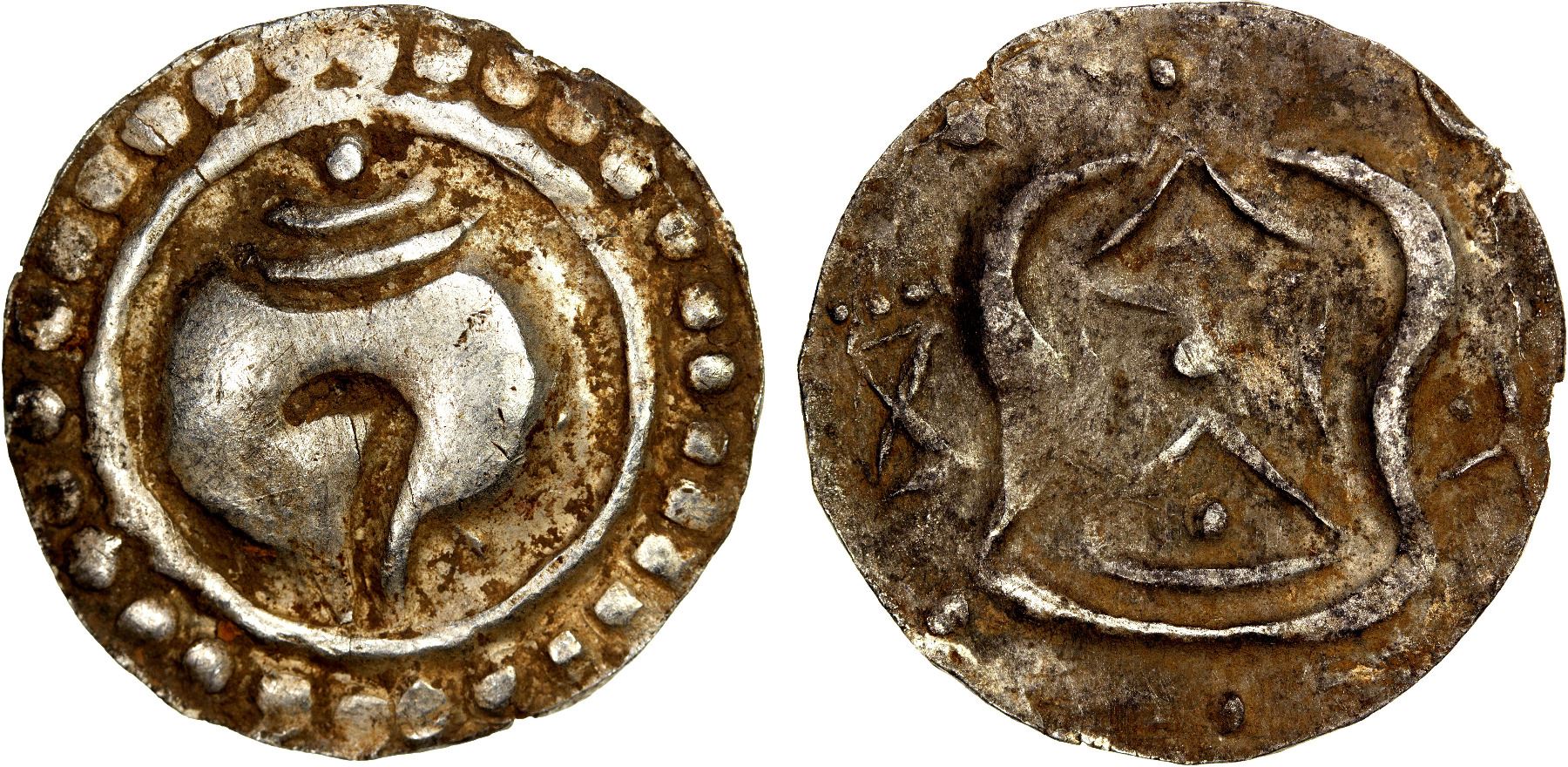 KYAIKKATHA: ca. 9th century, AR unit (9.22g), Mahlo-60.1.2, broad stylized conch shell, open to right, with two twists // srivatsa, bhadrapitha left & swastika right (assigned by Mitchiner to Syriam), choice VF-EF.