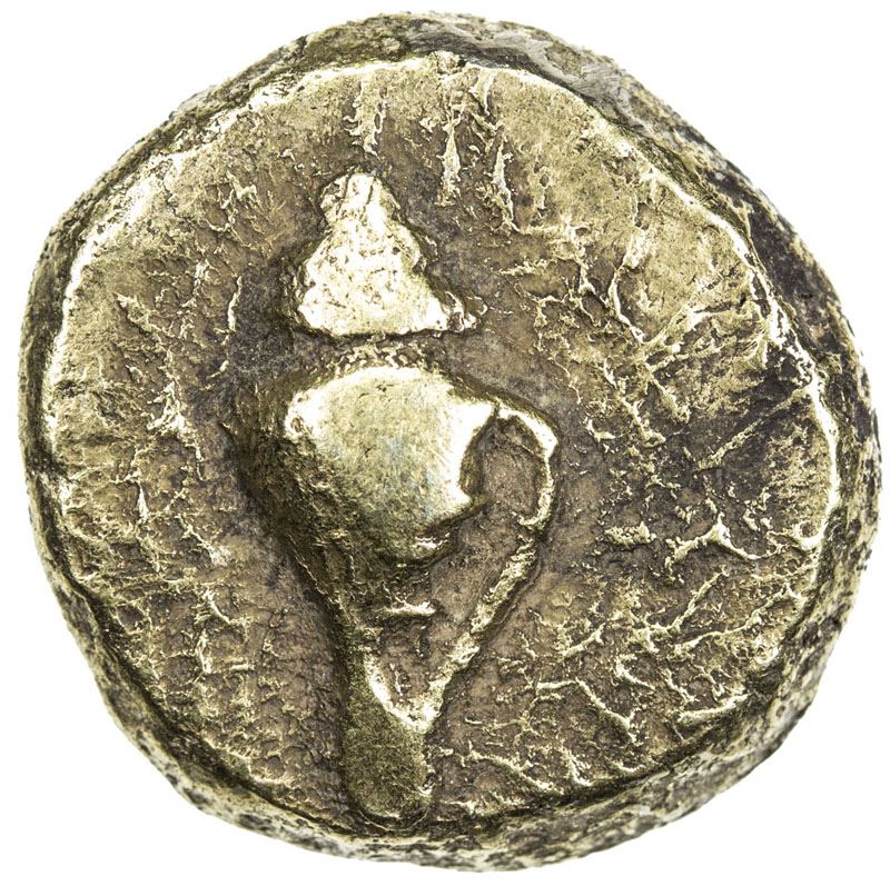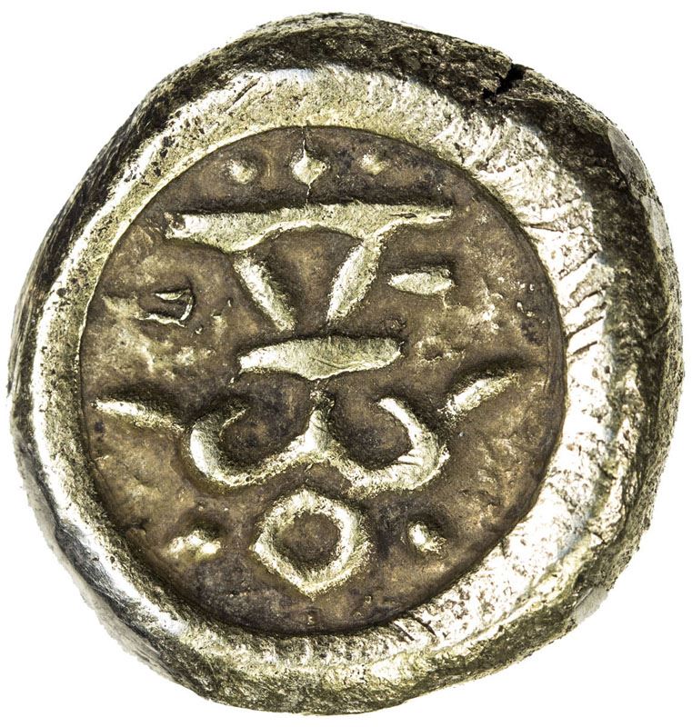 KYAIKTO: AV full unit (9.71g), ca. 1st century AD, Mahlo-2.1, Htun-150, sankha (conch shell) // group of three jewels below the indrayasti, VF to EF, RR, ex Hans Mondorf Collection.