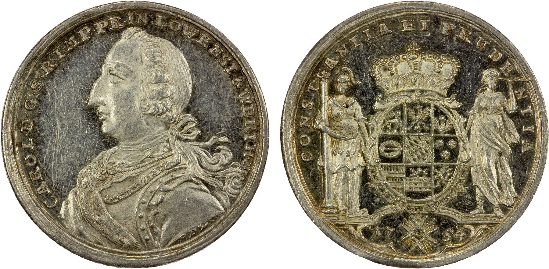 LÖWENSTEIN-WERTHEIM-ROCHEFORT: Karl Thomas, 1735-1789, AR ducat (2.58g), 1754, KM-Pn3, cf. KM-52 (AV), cf. Friedberg-1426 (AV), off-metal strike in silver, prooflike, AU, ex Joseph Lepczyk Auction 56, Lot 1680 (with tag).