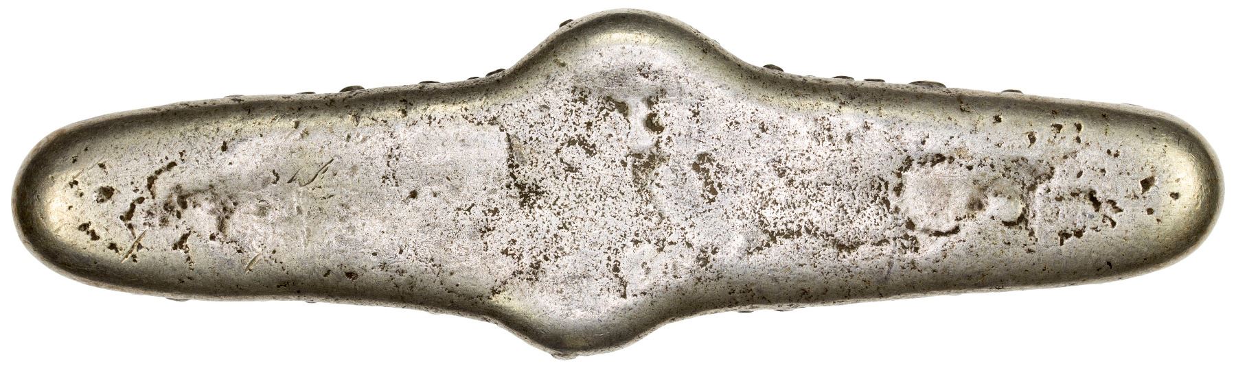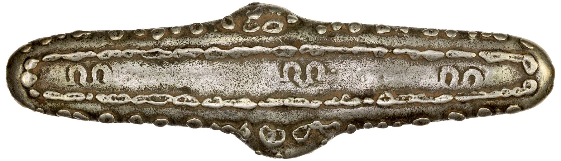 LAOS: Lanchang (Lan Xang), AR 2 tamlung (114.08g), ca. 1591-1707, Mitch-3004-06, 115mm, lat coinage (also known as tiger tongue money) on ingot with a bulging "waist", stamped three times with the Lanna letter na (snake symbol), a very unusual example, VF, ex Dr. Robert A. Rosenfeld Collection.
