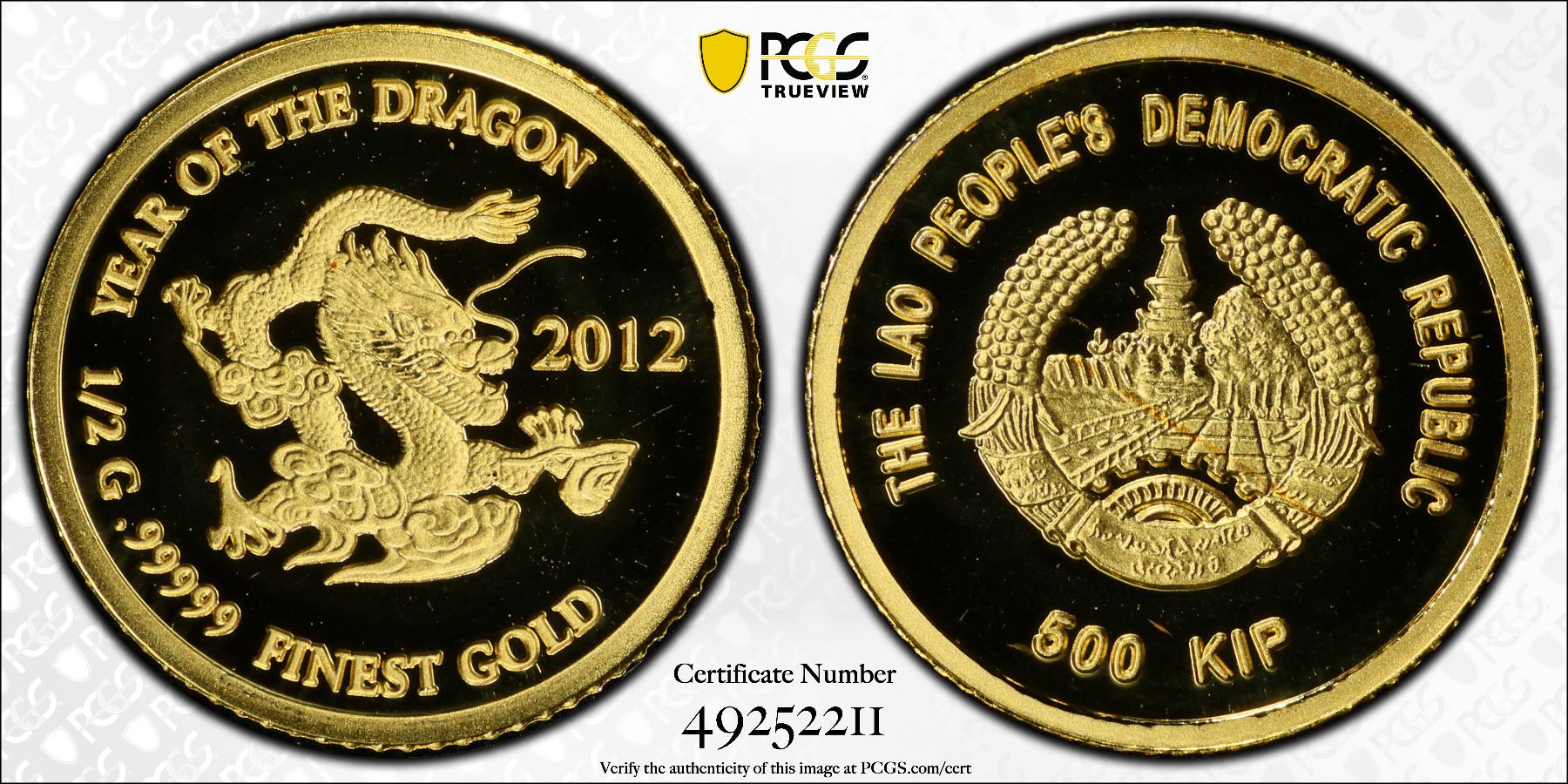 LAOS: People's Democratic Republic, AV 500 kip, 2012, N-57525, Chinese Zodiac - Year of the Dragon, PCGS graded Proof 69 DCAM, ex Howard A. Daniel III Collection.