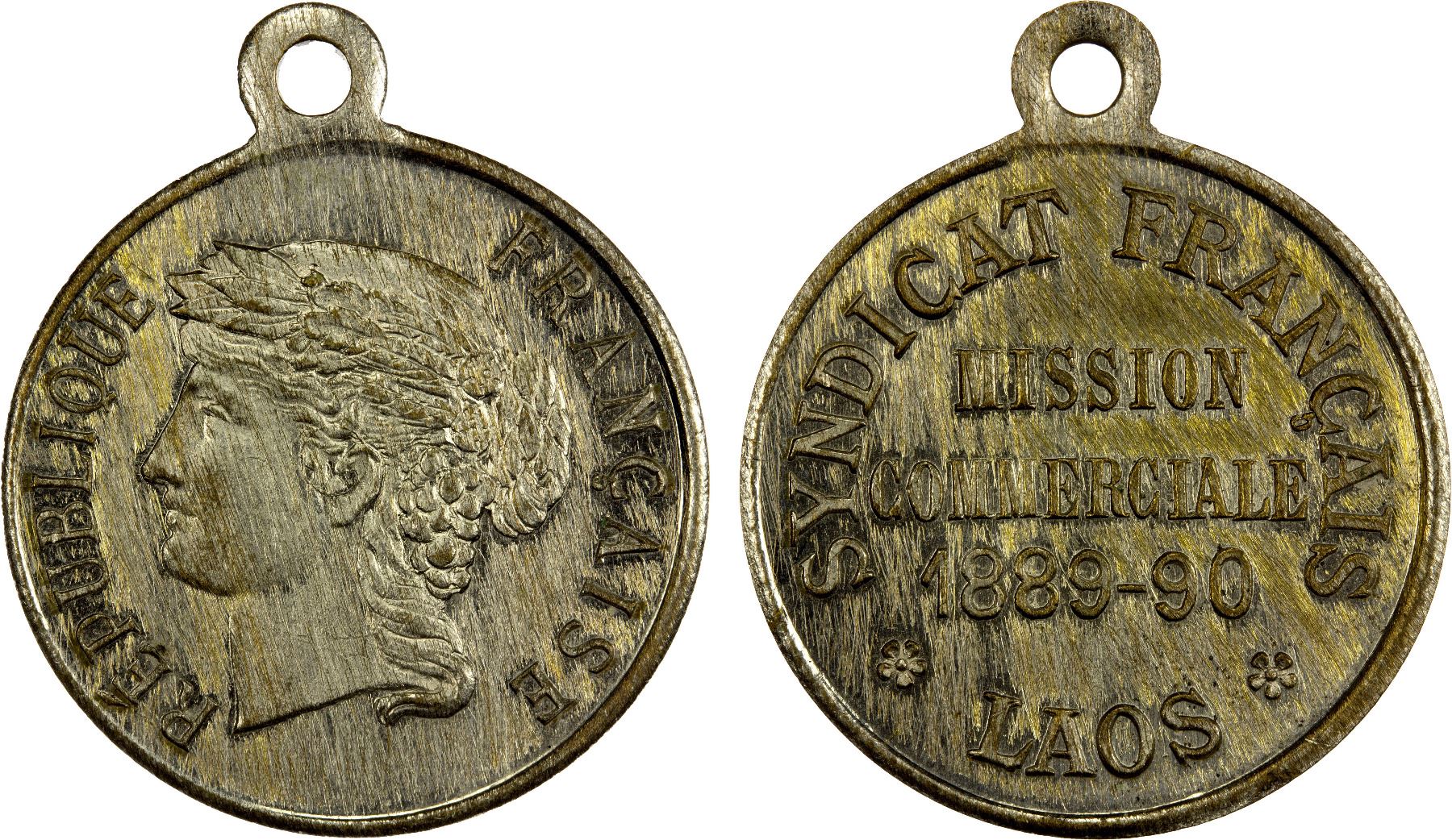 LAOS: Syndicat Français, AR medalet (3.40g), 1889-90, Daniel-M2b, 23mm nickel medalet for the Syndicat Français, Marianne facing left with RÉPUBLIQUE - FRANÇAISE around // SYNDICAT FRANÇAIS / MISSION / COMMERCIALE / 1889-90 / LAOS, with integral loop for suspension, light vertical marks (scratches?) on both sides, plain edge, Unc, S (Daniel).