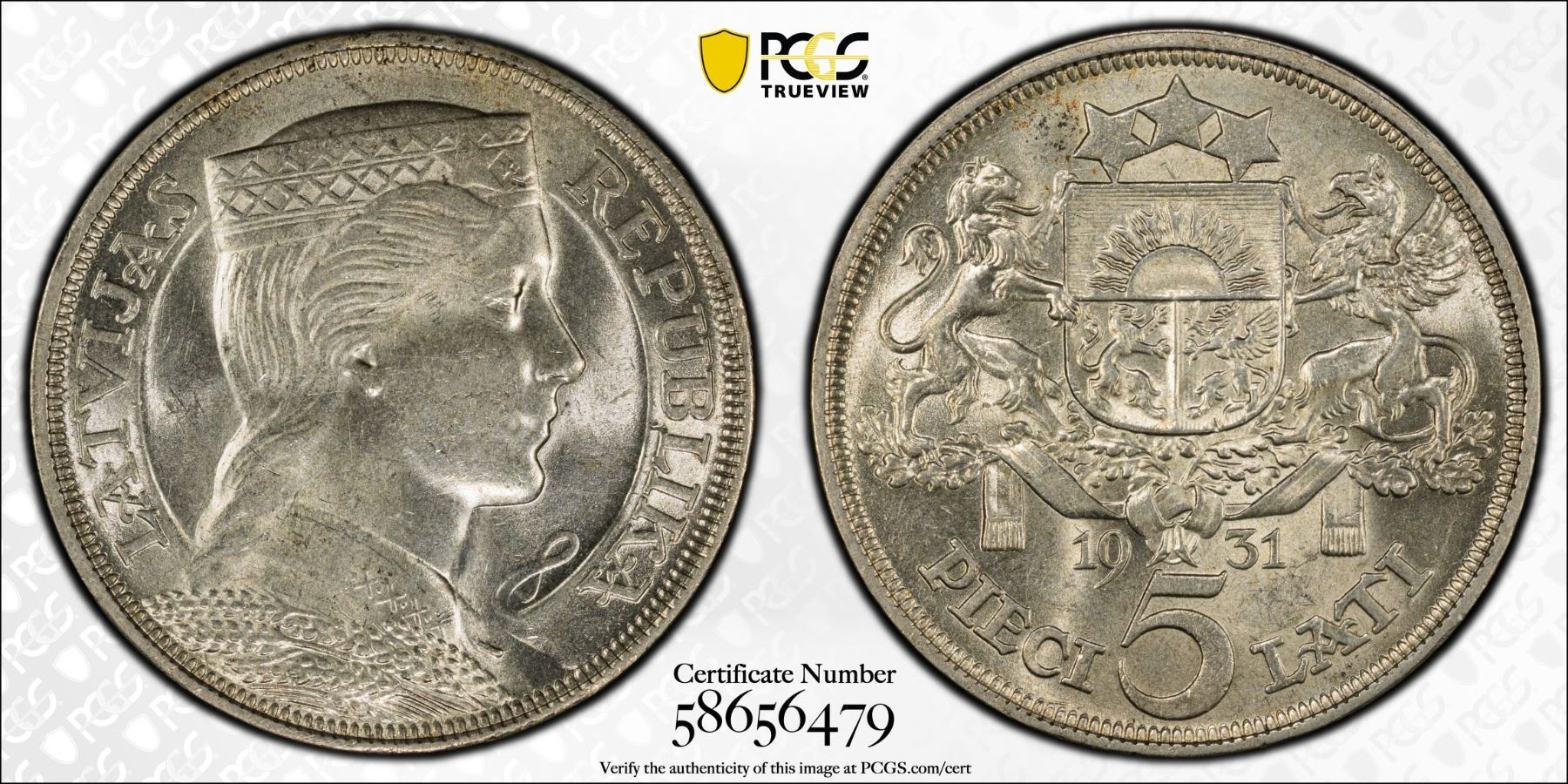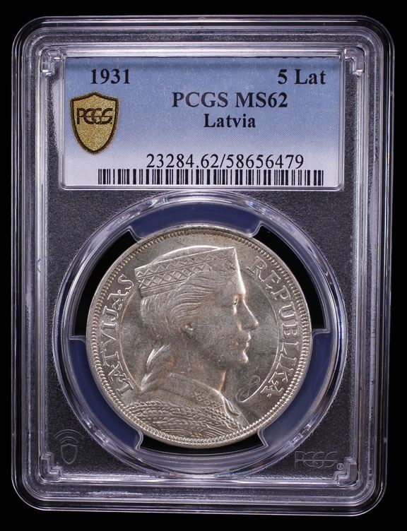 LATVIA: Republic, AR 5 lati, 1931, PCGS MS62