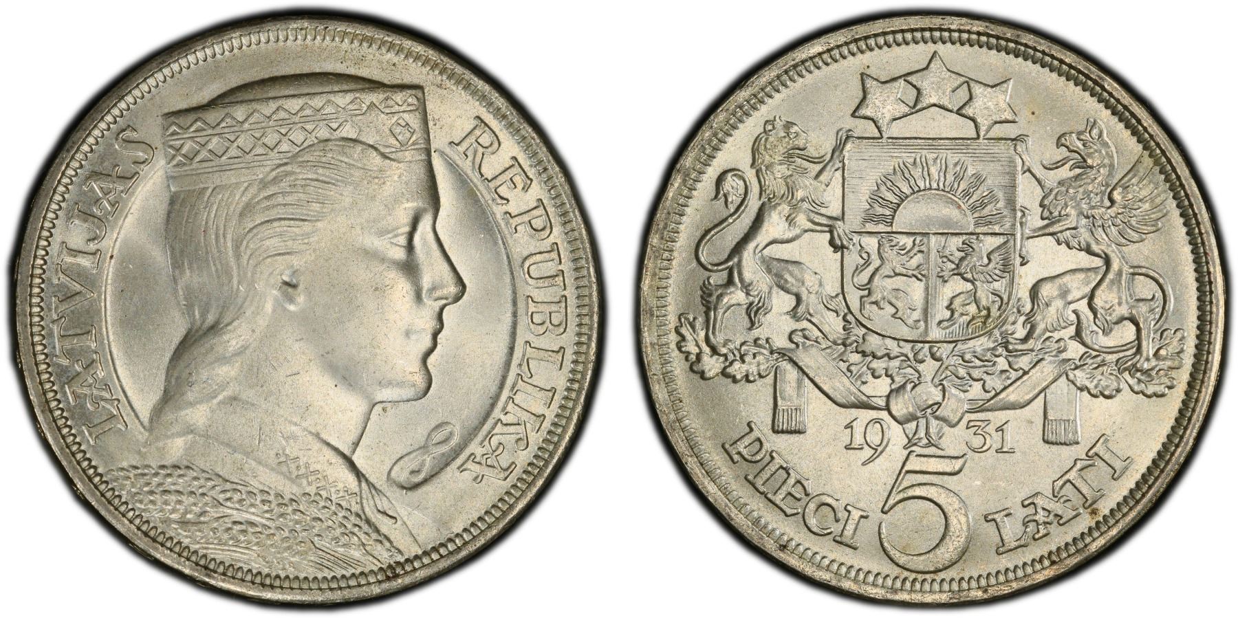 LATVIA: Republic, AR 5 lati, 1931, KM-9, a wonderful lustrous example! PCGS graded MS64.