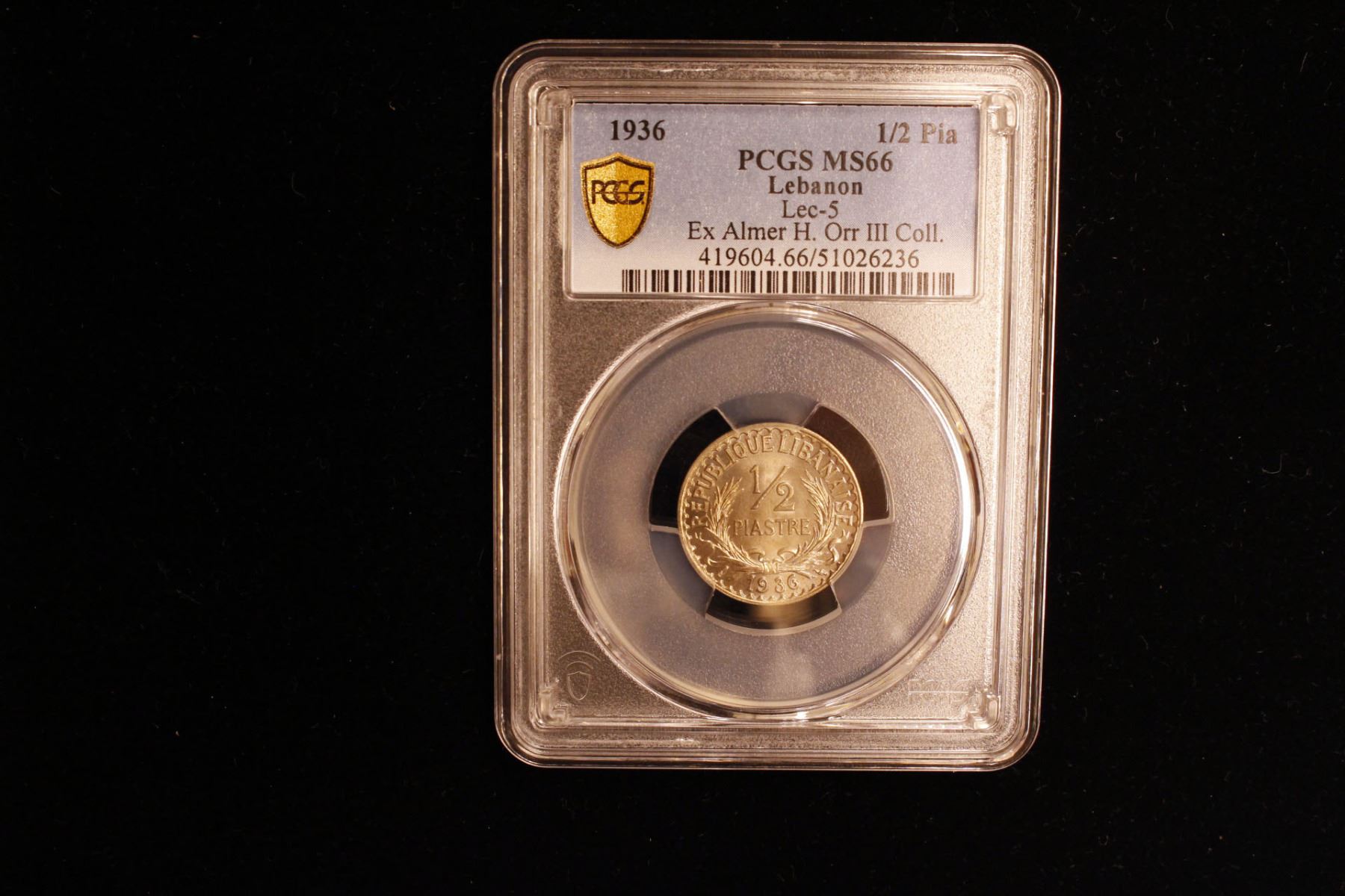LEBANON: French Mandate, 1/2 piastre, 1936, KM-9, a fantastic example, PCGS graded MS66, ex Almer H. Orr III Collection.
