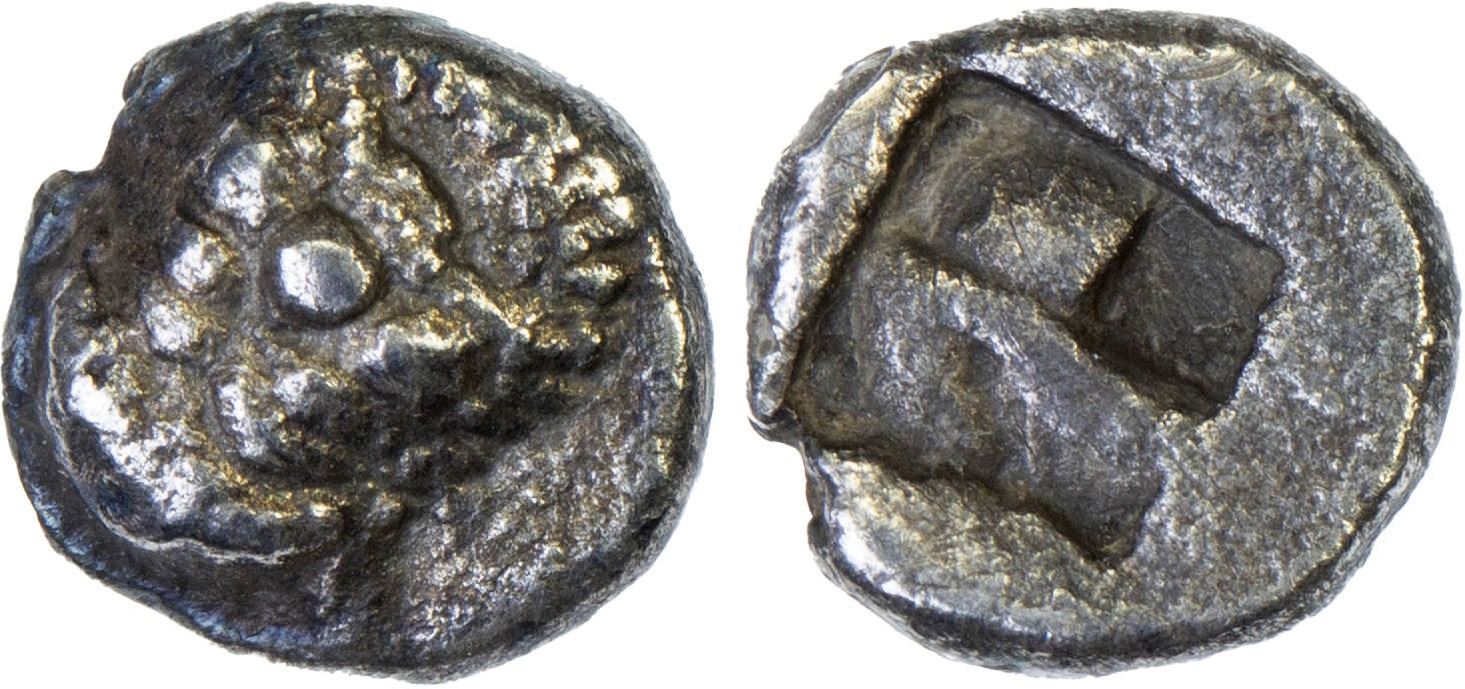 LESBOS: Methymna, AR hemiobol (0.24g), ca. 480-460 BC, head of Silenos facing // bipartite incuse square, unpublished and rare, VF, ex James Lamb Collection. See CNG e-Aucrion 248, Lot 136 for a similar example.
