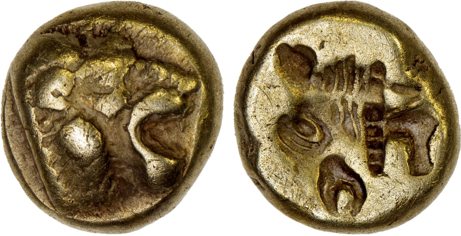 LESBOS: Mytilene, EL hekte (2.5g), ca. 521-478 BC, Bodenstedt-13, head of roaring lion right // incuse head of calf right, rectangular punch to left, VF-XF.