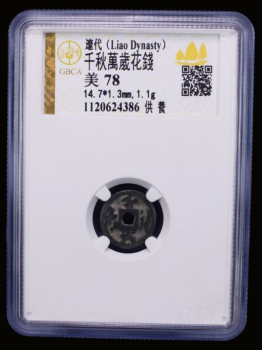 LIAO: Anonymous, AE temple charm (1.1g), qian qiu wan sui ("A thousand Autumns and Ten Thousand Years), graded 78 by GBCA Grading Company, F-VF, ex Dr. Dirk Löer Collection.