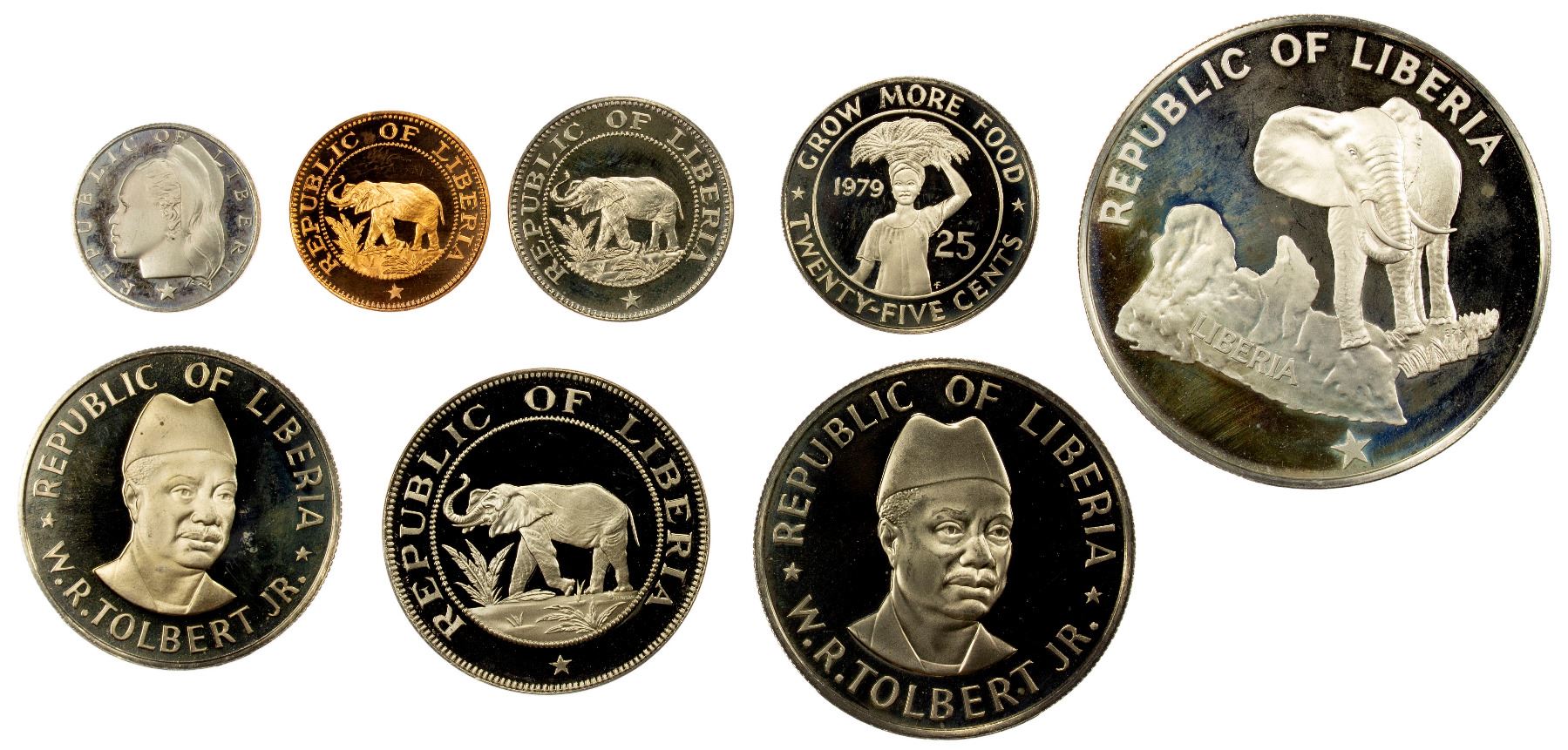 LIBERIA: Republic, SET of 8 coins, 1979-FM, all with edge lettering "O.A.U. July 1979", includes cent through 5 dollars (KM-13a, 12b, 14a, 15b, 30a, 31a, 32a, and 29), one-year types, no box, set of 8 pieces, Choice Proof, ex Dr. Wolfgang Schuster Collection.