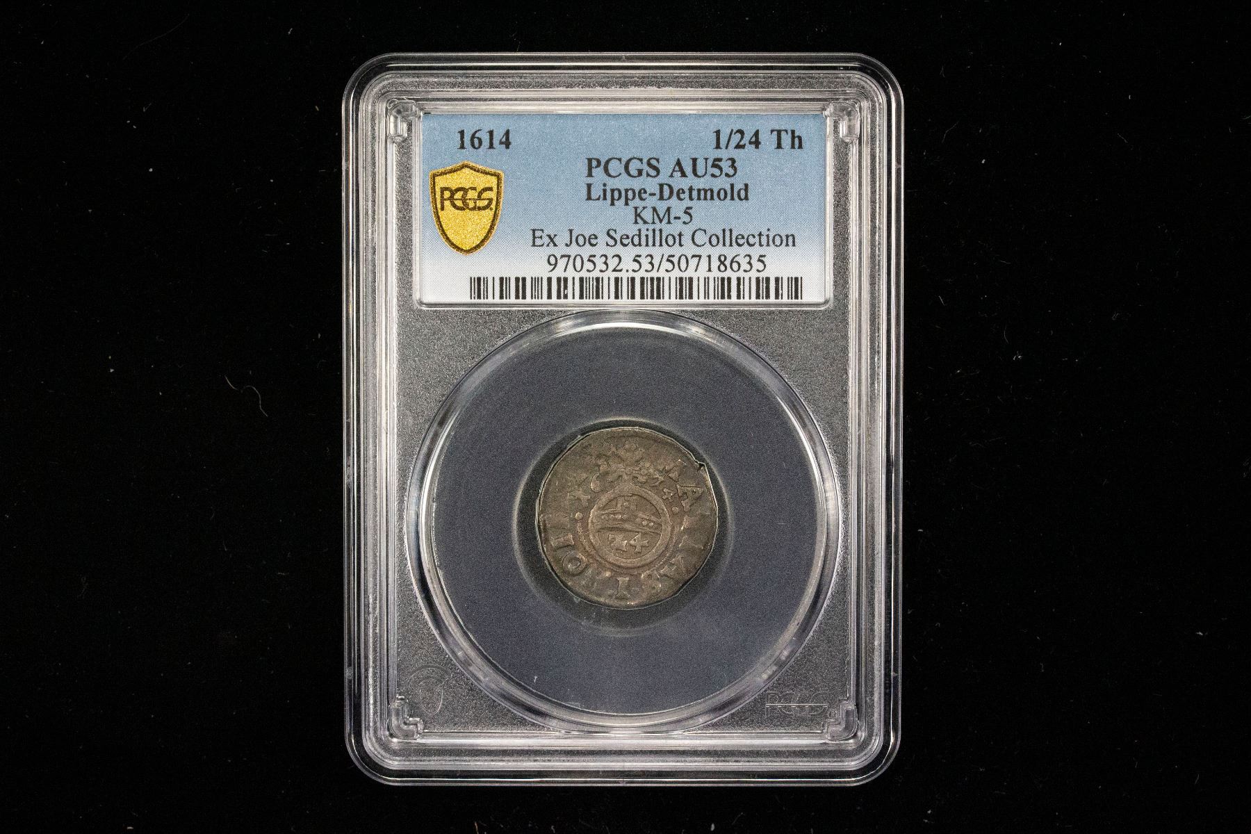 LIPPE-DETMOLD: Simon VII, Count, 1613-1627, AR 1/24 thaler (groschen), 1614, KM-5, a well struck lustrous argent example, PCGS graded AU53, ex Joe Sedillot Collection. Finest graded 'top pop' by PCGS!In 1601, Simon and his older brother Bernard traveled to Kassel, where they studied at the court school. After Bernard's untimely death in 1602, Simon returned to Brake, where his father introduced him systematically to the business of government. When his father died in 1613, he took up government. In 1617, he managed to end a bitter dispute his late father had with the city of Lemgo. Simon VI had tried to enforce Calvinism throughout the county, but the citizens of Lemgo preferred Lutheranism. The Treaty of Röhrentrup allowed Lutheranism in Lemgo and gave the city the right of High justice, which the city then used to organize witch trials.