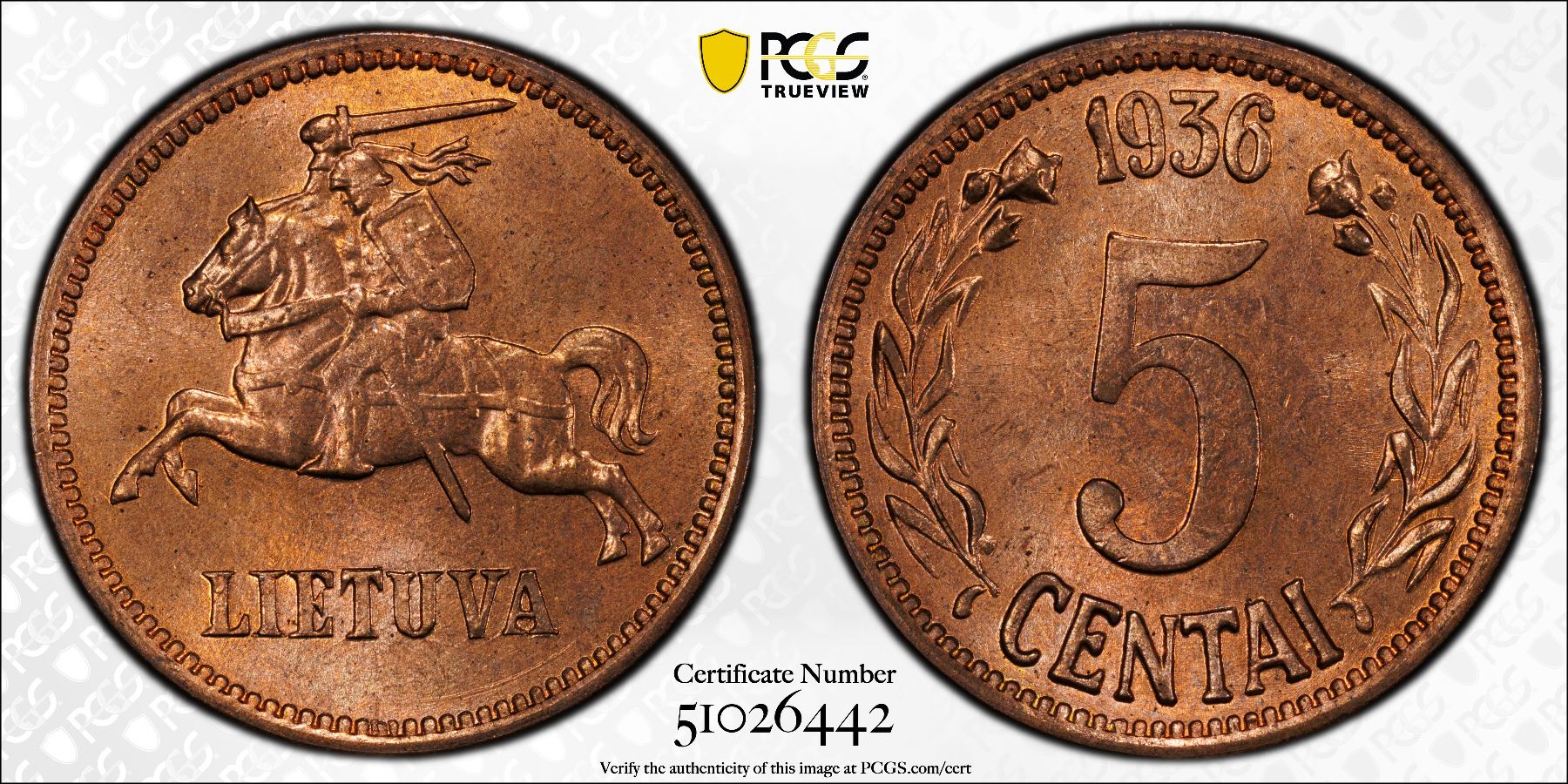 LITHUANIA: Republic, AE 5 centai, 1936, KM-81, Y-11, a superb red lustrous example! PCGS graded MS65 RD, ex Almer H. Orr III Collection.