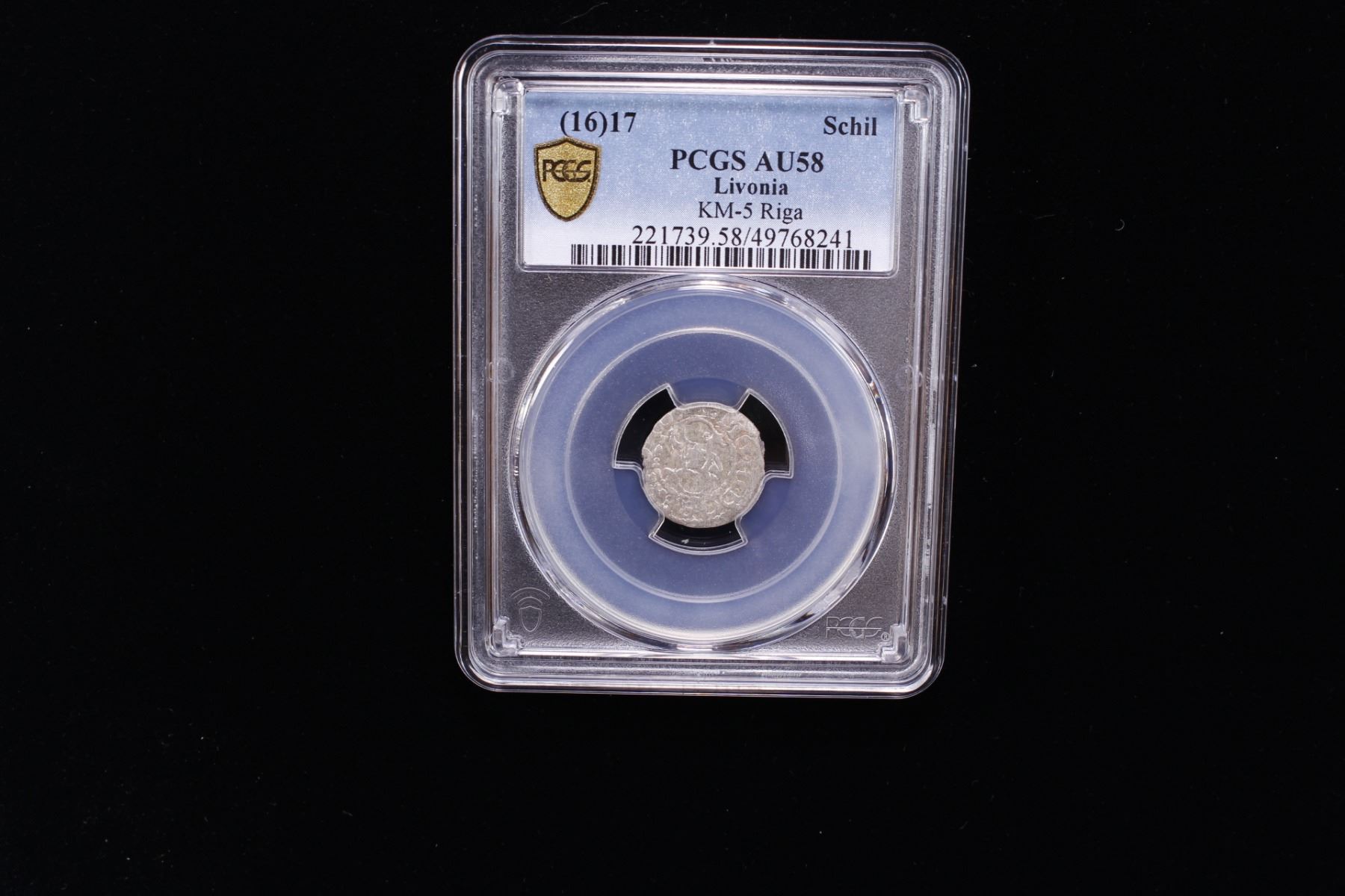 LIVONIA (POLISH): Sigismund III, 1587-1629, AR schilling, Riga, [16]17, KM-5, a lustrous near mint state example, PCGS graded AU58.