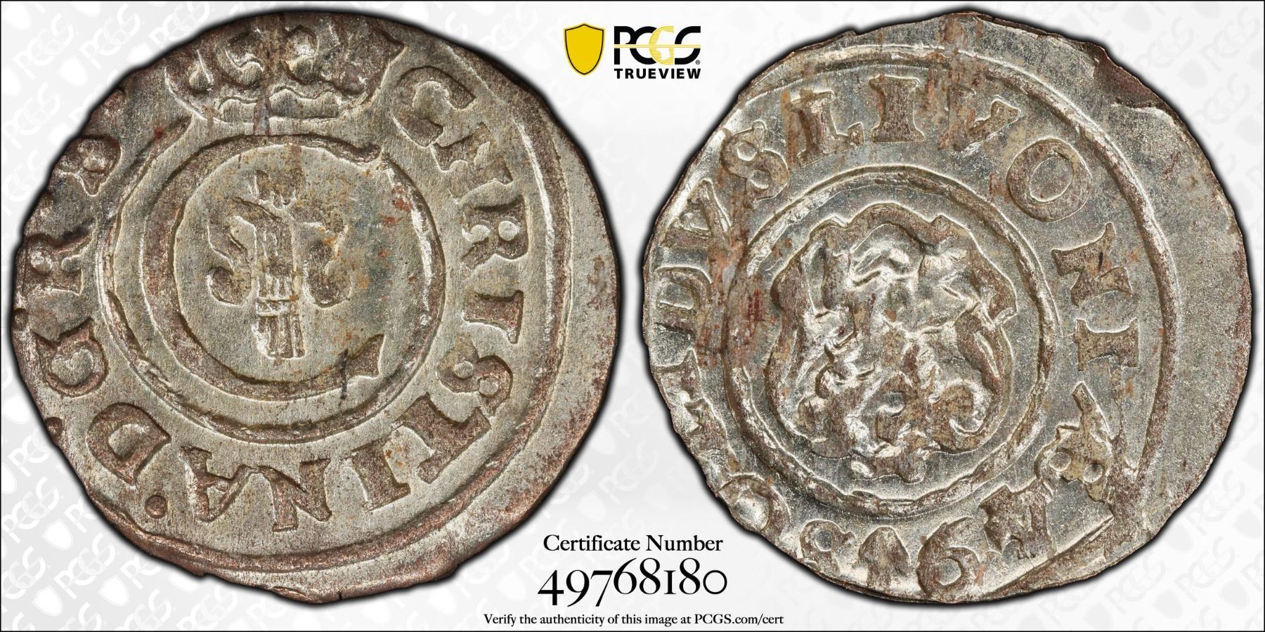 LIVONIA (SWEDISH): Christina, 1632-1654, AR solidus, Riga, [16]49, KM-2, Haljak II-1425, a lovely lustrous mint state example! PCGS graded MS63. Christina is remembered as one of the most erudite women of the 17th century, wanting Stockholm to become the "Athens of the North", and was given the special right to establish a university at will by the Peace of Westphalia. She is also remembered for her unconventional lifestyle and occasional adoption of masculine attire, which have been depicted frequently in media; gender and cultural identity are pivotal themes in many of her biographies.