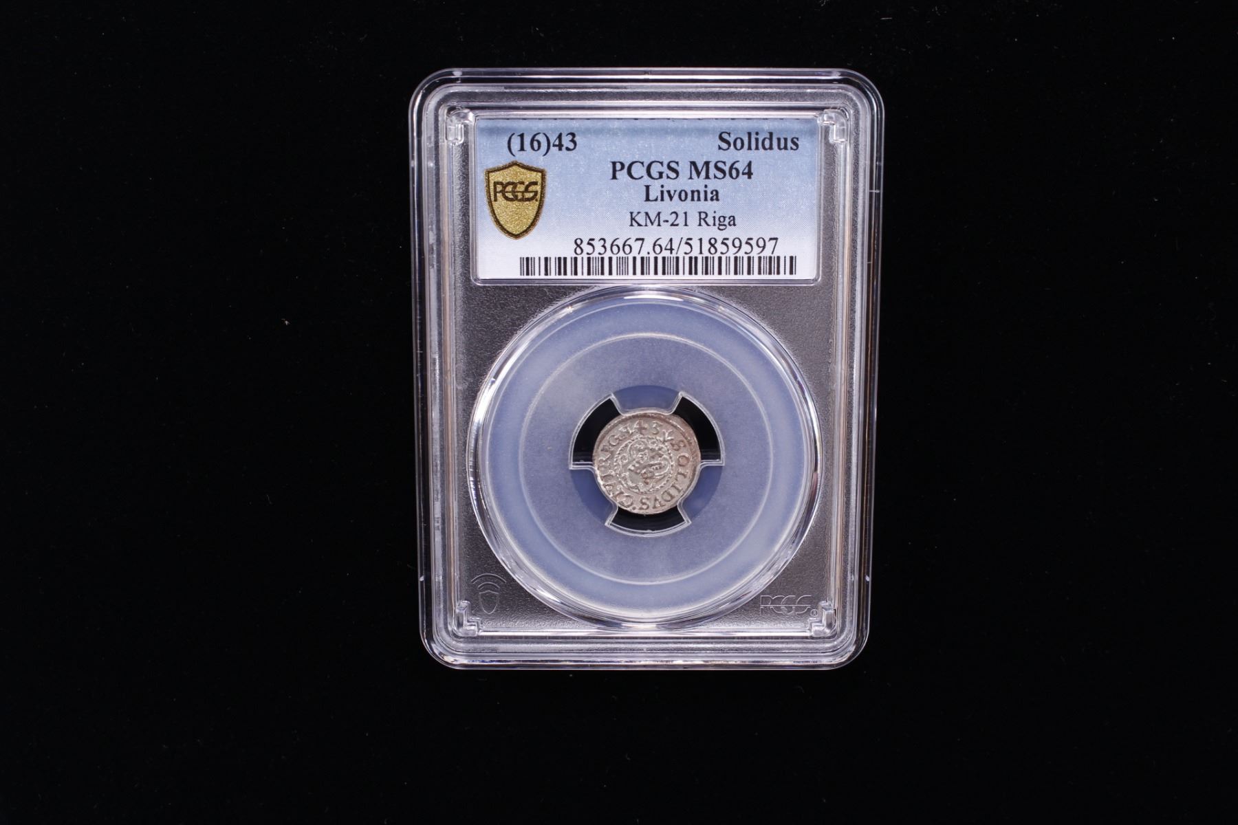 LIVONIA (SWEDISH): Christina, 1632-1654, BI solidus, Riga, [16]43, KM-21, Haljak-1525, a wonderful example, PCGS graded MS64.