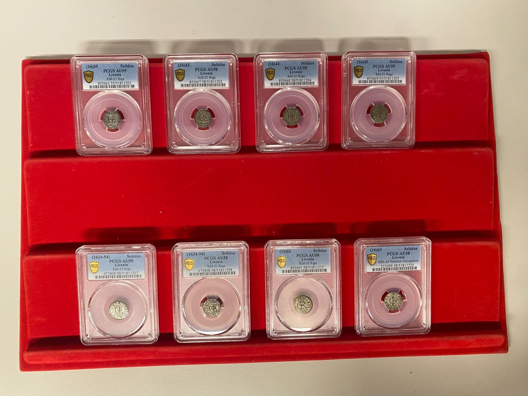 LIVONIA (SWEDISH): LOT of 8 coins, group of PCGS graded coins including Christina, 1632-1654, BI solidus, Riga mint KM-21, 1639 AU-58, 1643 AU-58, 1644 AU-58, 1645 AU-55, ND AU-58 (2), and Karl XI, 1660–1697, BI solidus, Riga, KM-55, 1661 AU-58, 1663 AU-58, an attractive group of lustrous about uncirculated coins all graded by PCGS, retail value $300, lot of 8 coins.