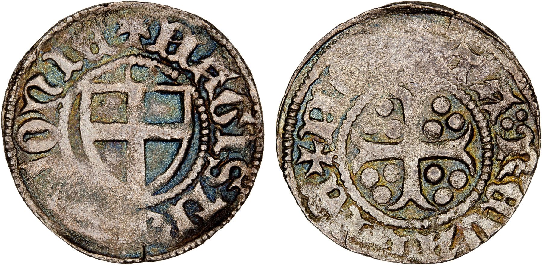 LIVONIAN ORDER: Zisse von Ruttenberg, 1424-1434, AR shilling (1.16g), Reval, arms // cross with 3 pellets in each of the orbs, about 10& flan, VF to XF.