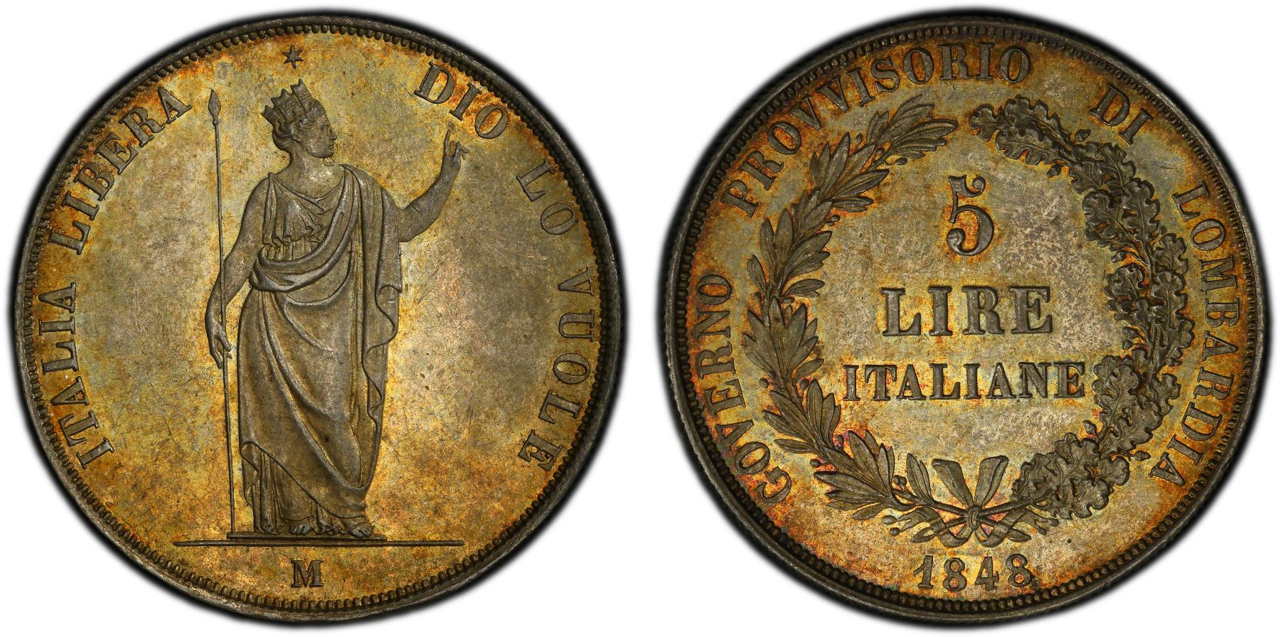 LOMBARDY: Provisional Government, AR 5 lire, 1848-M, Cr-22.1, short stems variety, a pleasing toned mint state example, PCGS graded MS62.