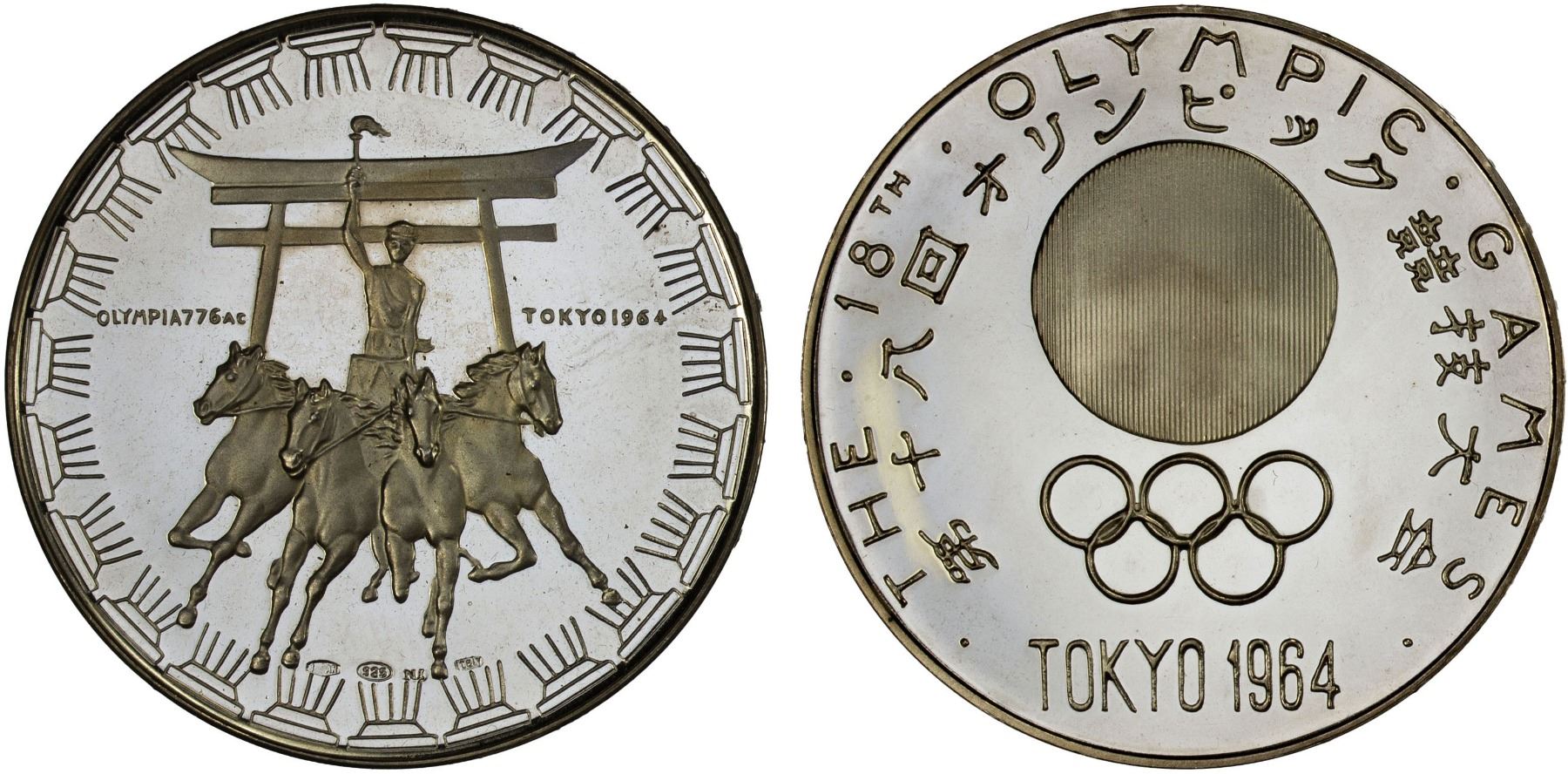 ITALY: Republic, AR medal (21.14g), 1964-NI, 45mm unsigned silver medal for the 1964 Summer Olympic Games in Tokyo, charioteer driving horses facing and holding torch above with temple gate behind and with OLYMPIA776AC in left field and TOKYO1964 in right field, all within ornate border // scored disc above Olympic rings with THE 18th OLYMPIC GAMES around, the Japanese equivalent legend below, and "TOKYO 1964" at bottom, a few hairlines but much better than average, in original Numismatica Italiana case, UFFICIALE - N.I. - MEDAGLIA on edge, Proof.