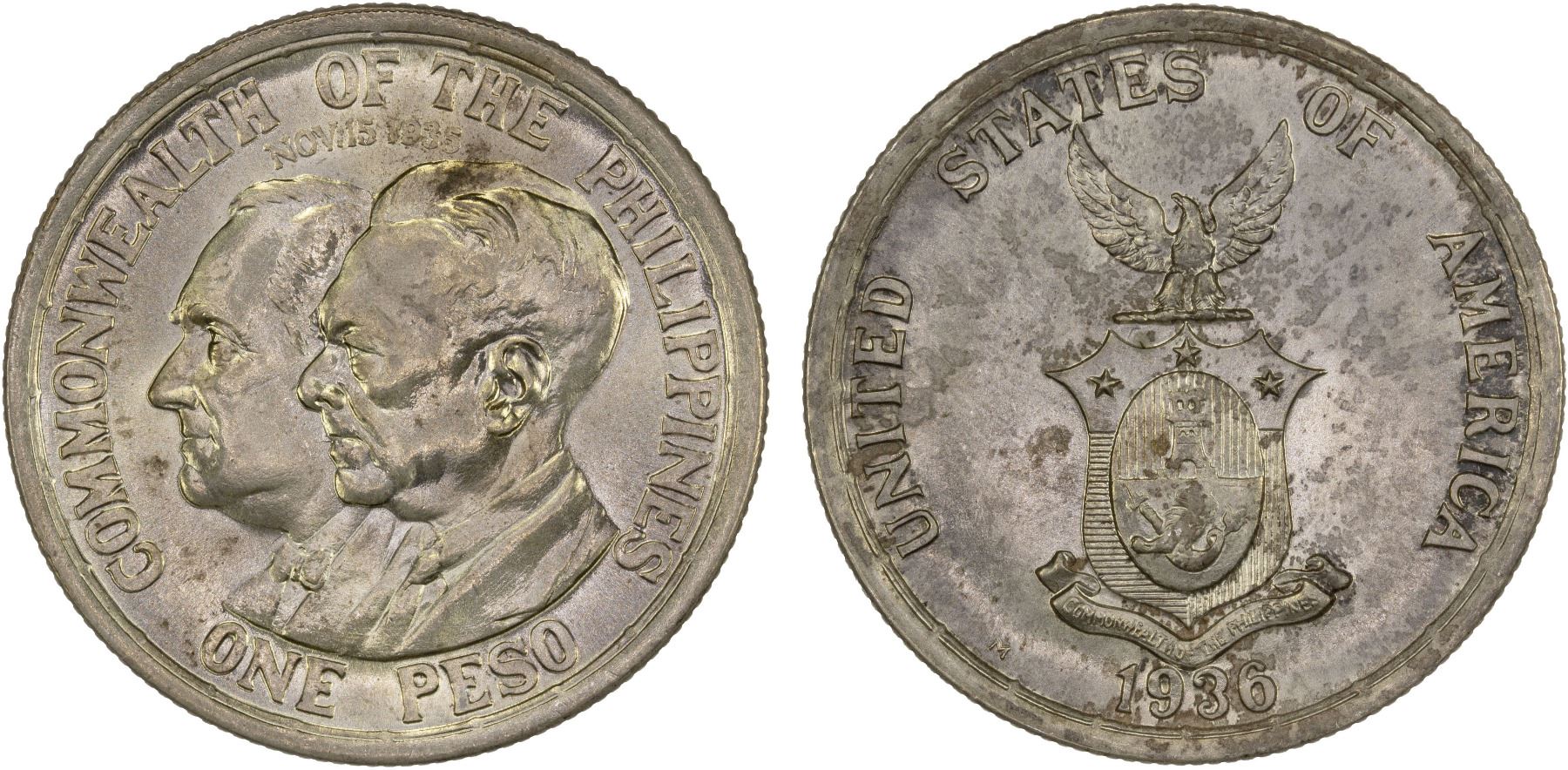 PHILIPPINES: Commonwealth, AR peso, 1936-M, KM-177, Establishment of the Commonwealth - Roosevelt and Quezon, Brilliant Unc.