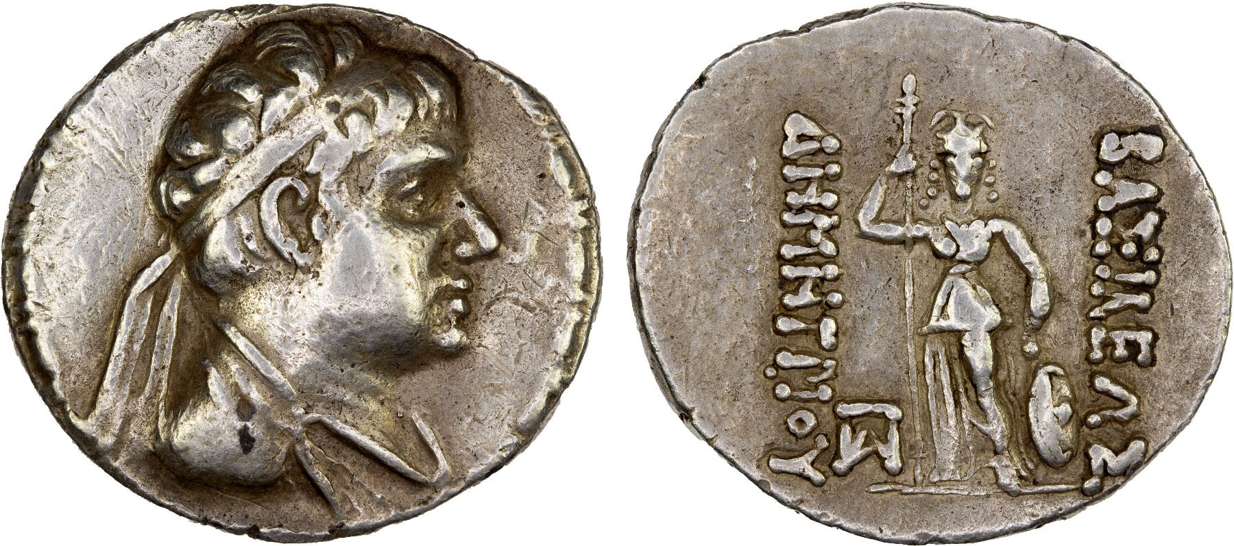 BACTRIA: Demetrios II, ca. 150-145 BC, AR tetradrachm (16.42g), Bop-1E, Mitch-101f, diademed and draped bust right // Athena standing facing, holding spear and resting hand on grounded bow, monogram to lower inner left, lightly buffed, very rare, VF