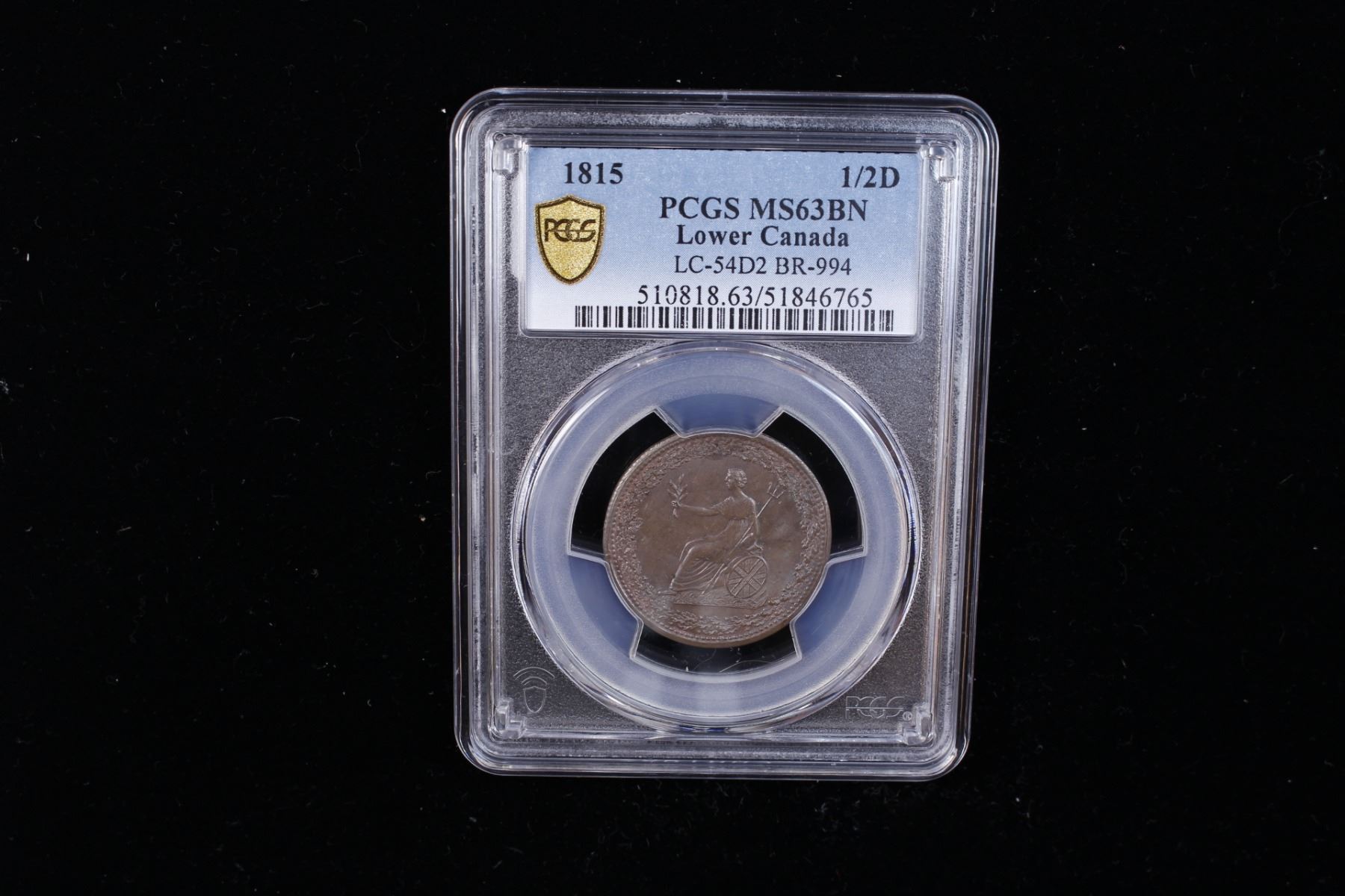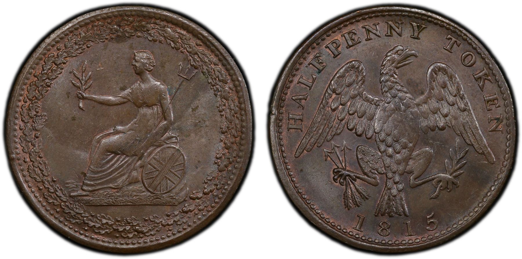 LOWER CANADA: AE 1/2 penny token, 1815, LC-54D2, Breton-994, Britannia and Eagle type, clockwise wreath variety, a lovely chocolate-brown mint state example! PCGS graded MS63 BN.