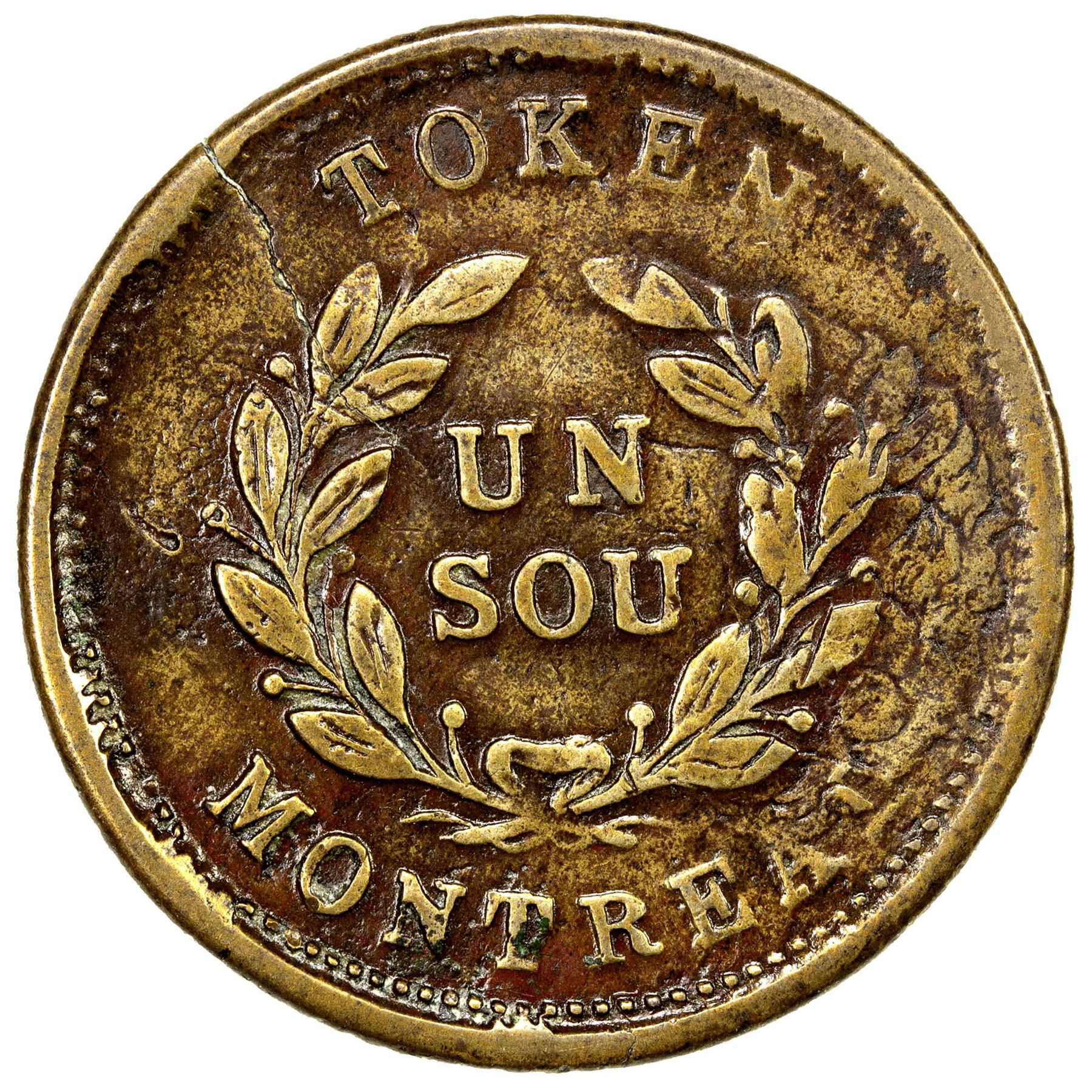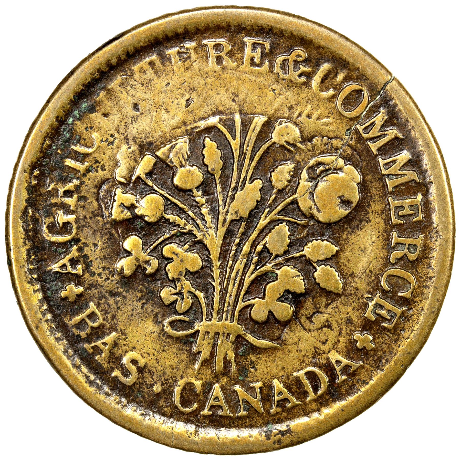 LOWER CANADA: British Administration, AE un sou token (5.79g), ND (ca. 1837), Charlton-LC-40A10, Breton-674var, Montreal issue in brass, coarsely reeded, medal alignment, struck over 1820 Bust and Harp token (Breton-1012), which looks like it was also struck over another piece, Very Good to Fine, RR, ex Donald G. Partrick Collection (with envelope), ex Warren Baker (with tag).