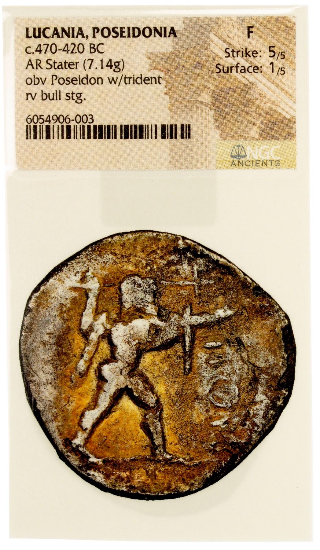 LUCANIA: Poseidonia, AR stater (7.14g), ca. 470-420 BC, HNI-1114, SNG ANS 646, Poseidon advancing right, brandishing trident, ΠOM to right // bull standing right, light surface crystallization, Strike 5/5, Surface 1/5, NGC graded Fine.