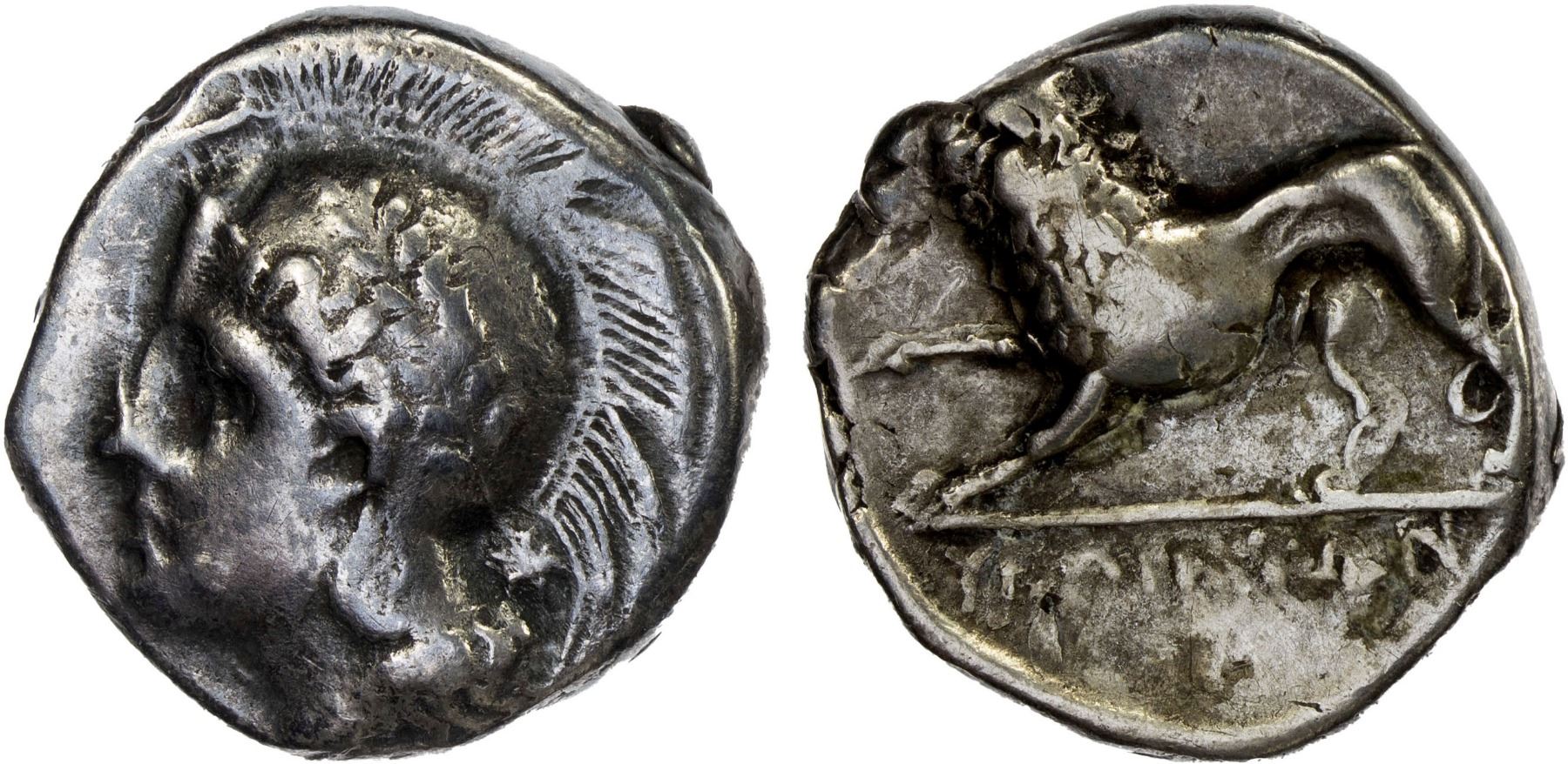 LUCANIA: Velia, AR didrachm (7.43g), ca. 334-300 BC, HNI-1298, SNG Lockett 553, head of Athena left, wearing crested Attic helmet with olive wreath // Lion advancing left with right paw raised, traces of old corrosion, F-VF.