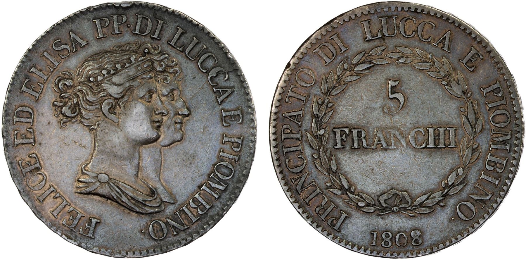LUCCA: Felix Bacciocchi and Elisa (Bonaparte), AR 5 franchi, 1808/7, KM-24.3, MIR-244/4, small obverse rim bump, overdate certain, toned, Choice VF.