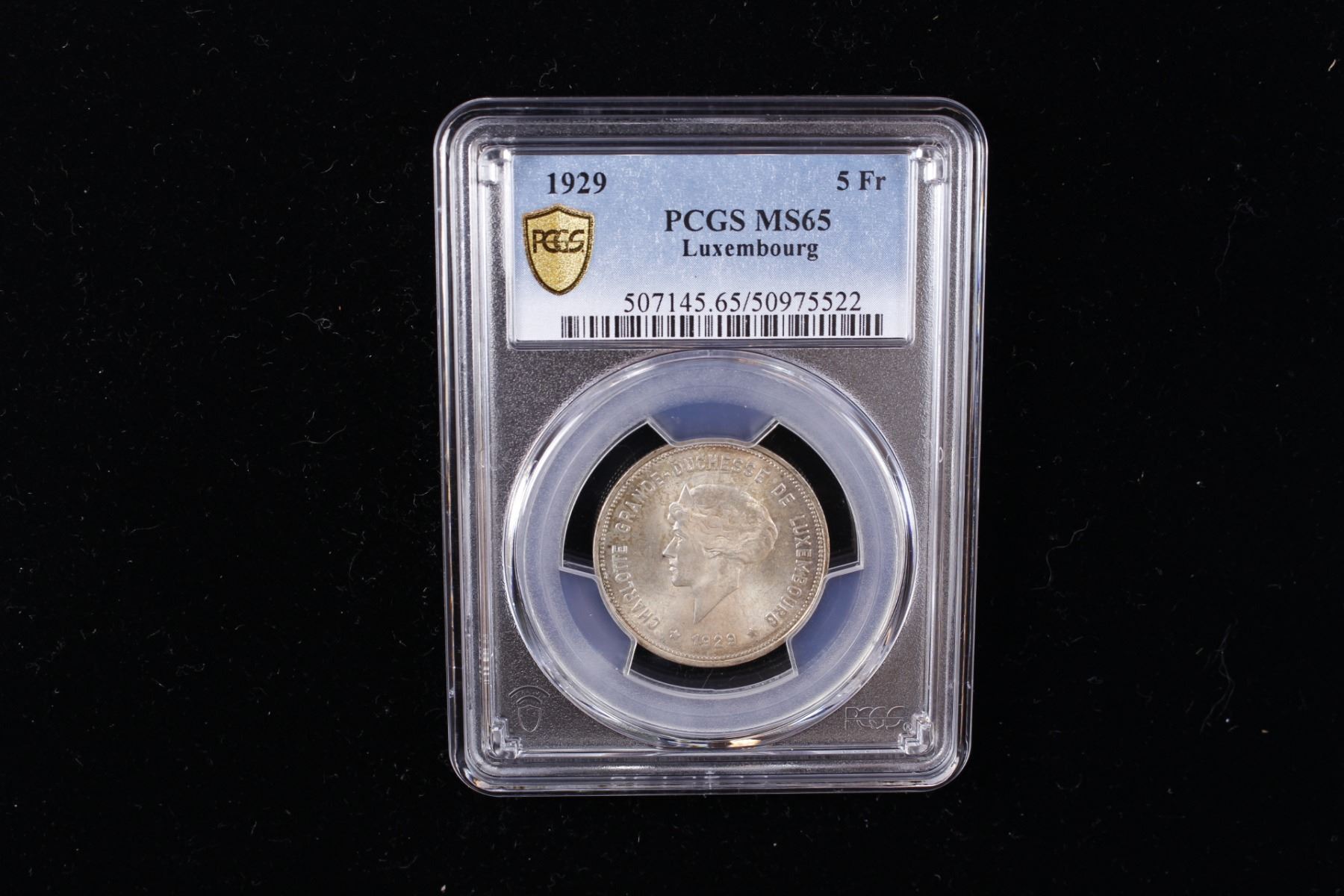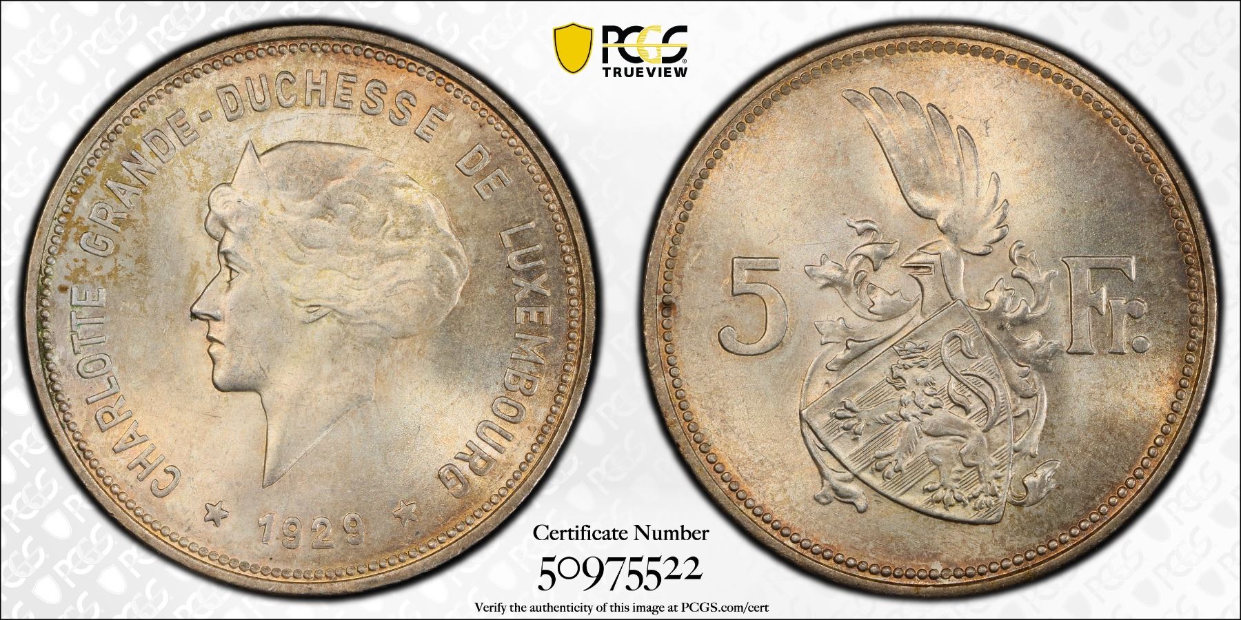 LUXEMBOURG: Charlotte, 1919-1964, AR 5 francs, 1929, KM-38, struck at the Stuttgart Mint, a superb lustrous example! PCGS graded MS65, ex Almer H. Orr III Collection.