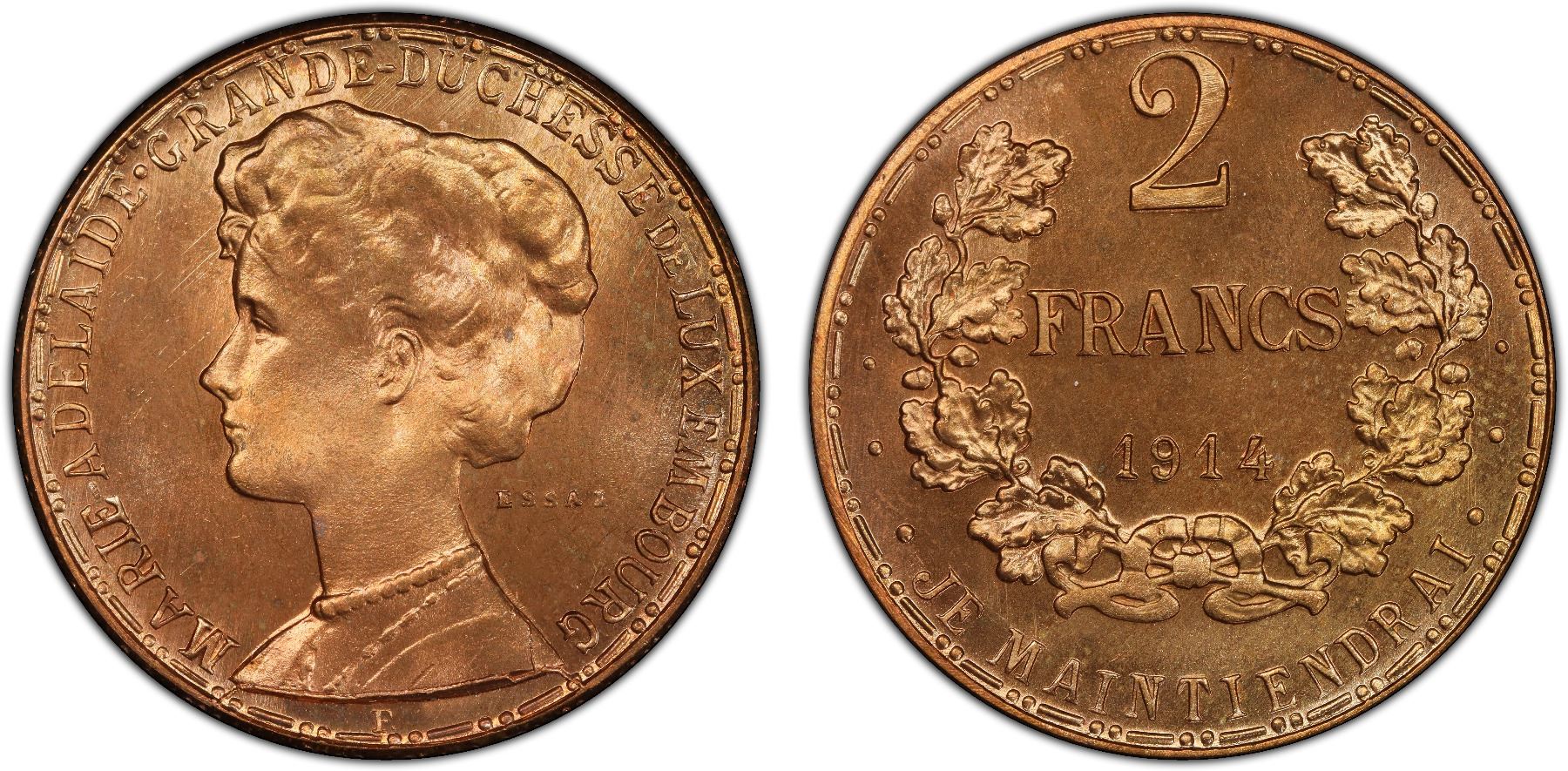 LUXEMBOURG: Marie-Adelaïde, 1912-1919, AE 2 francs, 1914, PCGS Specimen 66 RD