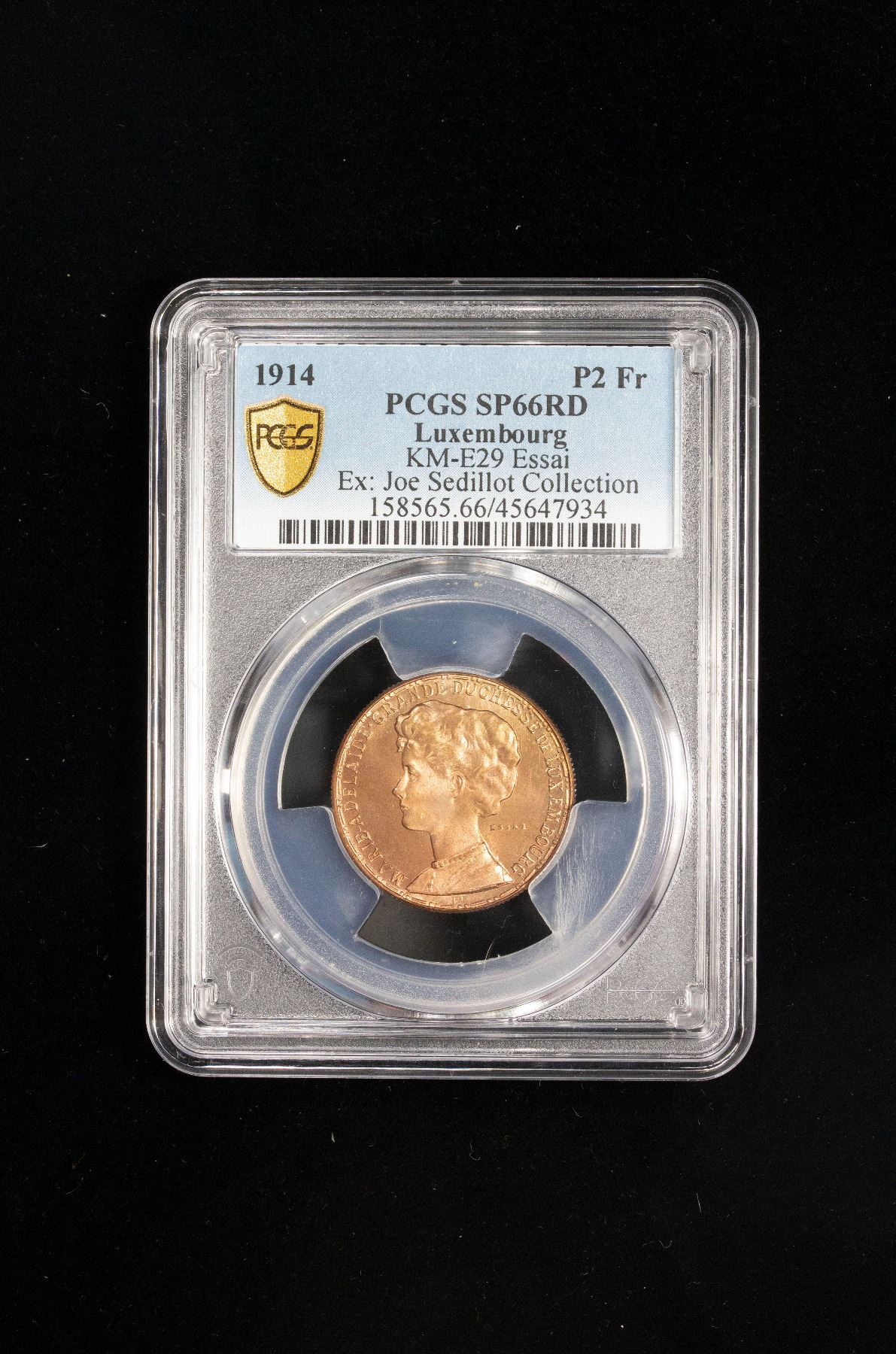 LUXEMBOURG: Marie-Adelaïde, 1912-1919, AE 2 francs, 1914, KM-E29, Essai, Brussels mint trial strike in copper, PCGS graded Specimen 66 RD, ex Joe Sedillot Collection. This type, together with the 1914 50 centimes (Essai) and 1 franc (Essai), are the only pieces representing the portrait of Marie-Adelaïde. She became Grand Duchess of Luxembourg following the death of her father Guillaume IV in 1912. After the first world war, she abdicated in 1919 under pressure from the Luxembourg parliament in favor of her younger sister Charlotte. The Luxembourg population reproached her with too much involvement in the country's political affairs and having maintained relations with Germany.