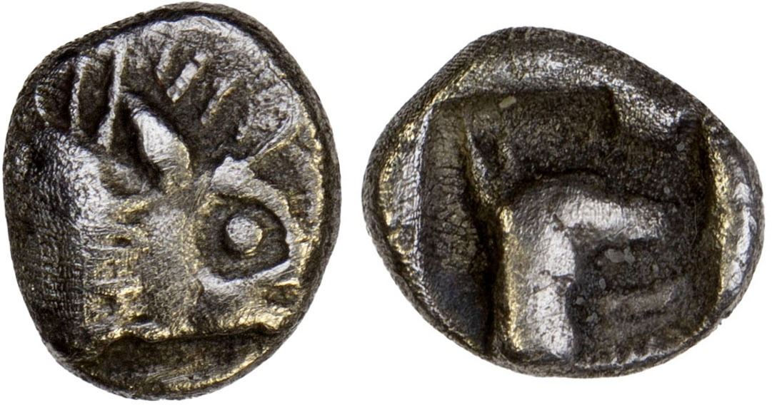 LYCIAN DYNASTS: Uncertain Ruler, AR hemiobol (0.33g), 5th Century BC, Traité II 184, forepart of boar right // forepart of hound right, wearing leash, all within incuse square, rare, VF, ex James Lamb Collection.