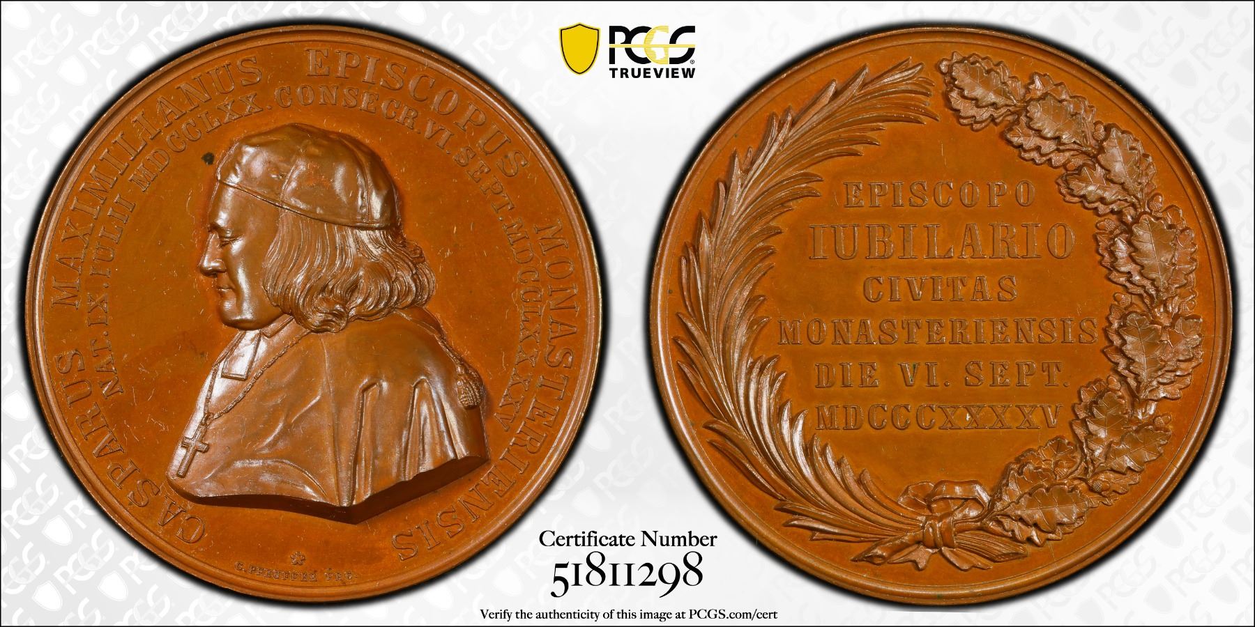 MÜNSTER: Caspar Maximilian von Droste-Vischering, Bishop, 1826-1846, AE medal, 1845, Weweler-215, Sommer-P 79, 42mm bronze medal by Christoph Carl Pfeuffer for the Birshop's 50th anniversary of priesthood; CASPARUS MAXIMILIANUS EPISCOPUS MONASTERIENSIS / NAT. IX. JULII MDCCLXX. CONSECR. VI. SEPT. MDCCLXXXXV around capped, cloacked bust facing left, C.PFEUFFER FEC. under obverse bust // EPISCOPO / JUBILARIO / CIVITAS / MONASTERIENSIS / DIE VI. SEPT. / MDCCCXXXXV, in Six line legend surrounded by a ribboned wreath of palm and laurel, a wonderful specimen quality example! PCGS graded Specimen 64.