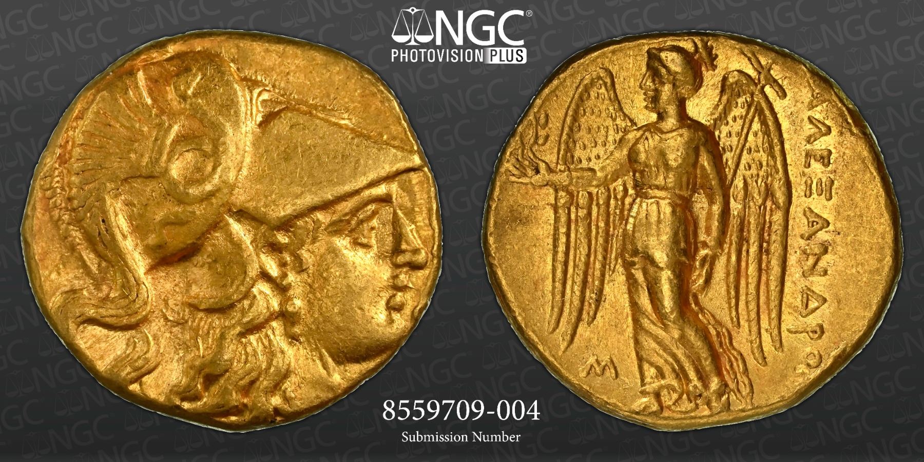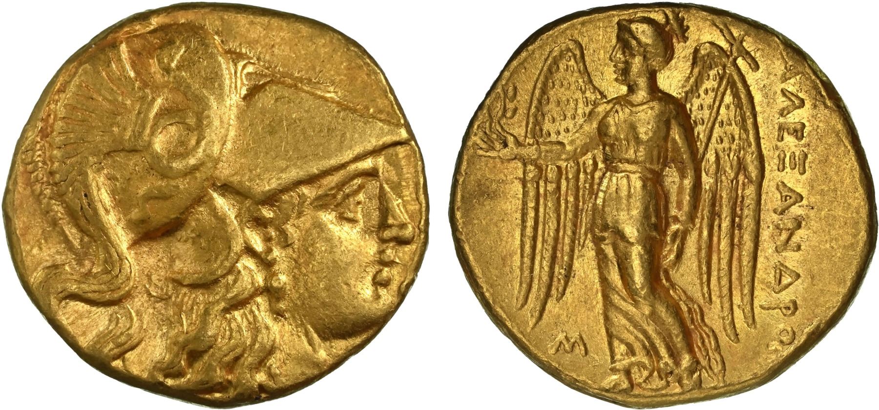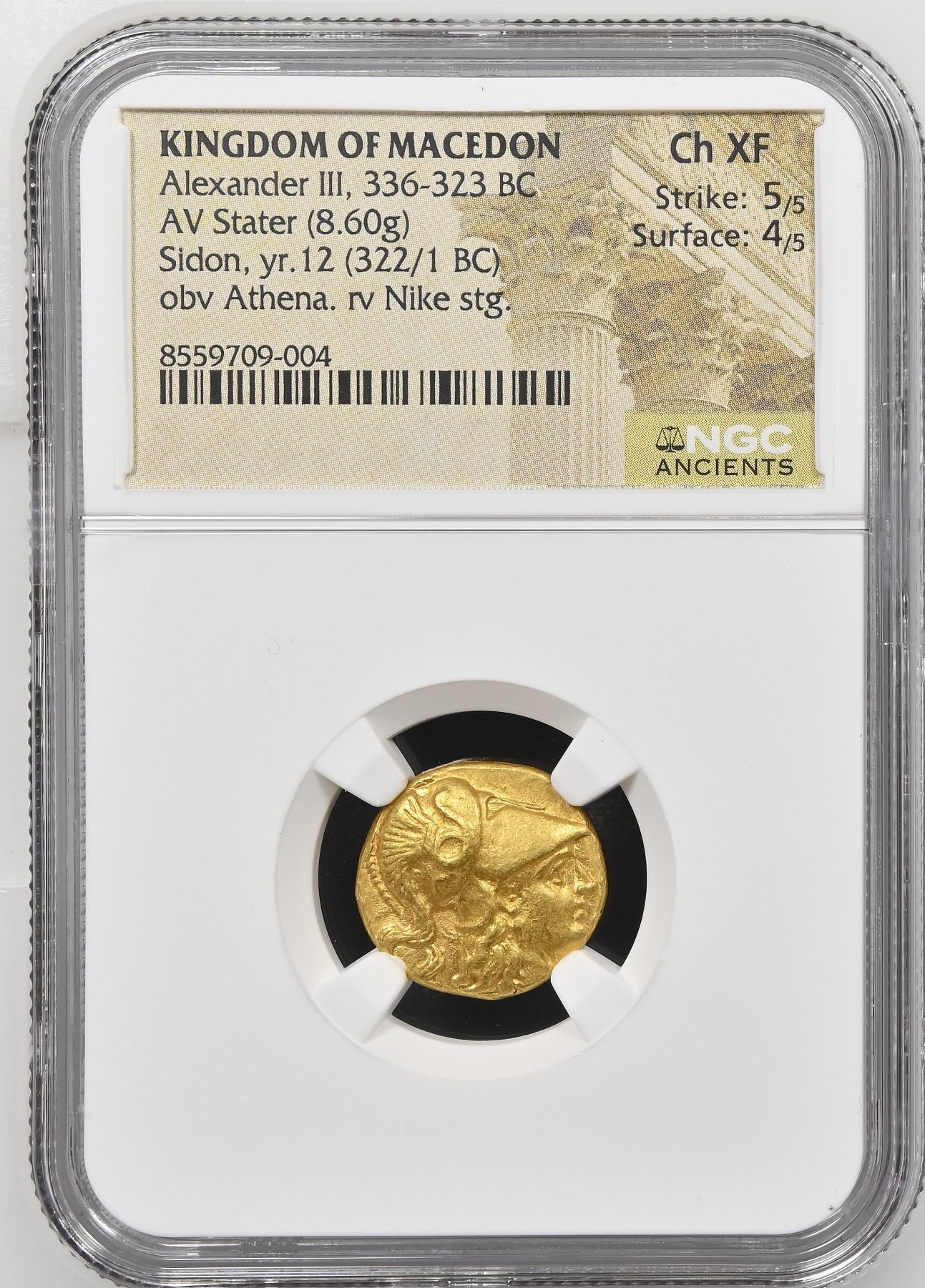 MACEDONIAN KINGDOM: Alexander III 'the Great', 336-323 BC, AV stater (8.60g), Sidon, year 12 (322/1 BC), Price-3497, DCA-874, early posthumous issue struck under Laomedon, helmeted head of Athena right // Nike standing left, holding wreath in right hand and stylis in left arm, M (date) to lower left, a well-centered strike from fine dies, attractive light luster in fields, very rare, Strike 5/5, Surface 4/5, NGC graded Choice XF, ex CNG e-Auction347, Lot 110.