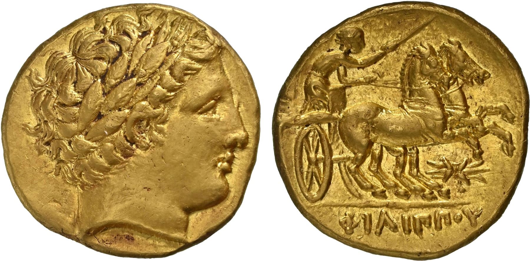 MACEDONIAN KINGDOM: Philip II, AV stater (8.61g), Pella, ca. 340/336-328 BC, Le Rider pl. 56, 95, laureate head of Apollo right // charioteer driving biga right, thunderbolt below horses, ΦIΛIΠΠOY in exergue, mount carefully removed at reverse 9h, light brushing on obverse, with much attractive luster, Choice AU, ex Rauch Auction 97, Lot 104.
