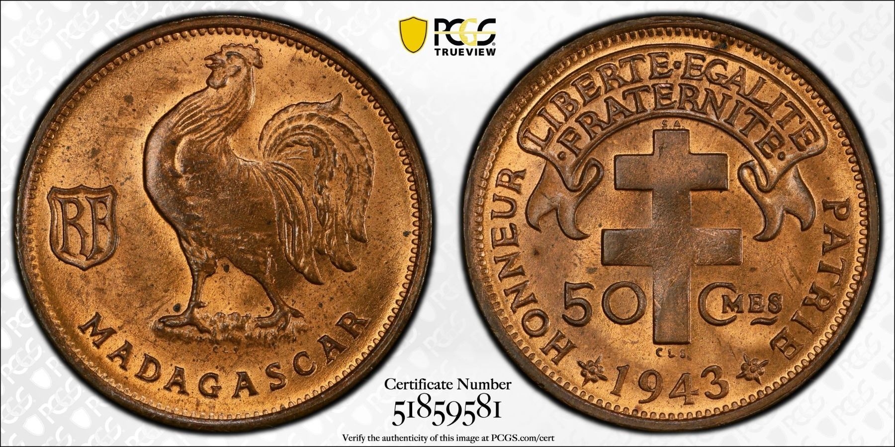 MADAGASCAR: AE 50 centimes, 1943, KM-1, Lec-93, Free French WWII issue, struck at the South African mint, Pretoria, a wonderful example, PCGS graded MS64 RB, ex Almer H. Orr III Collection.