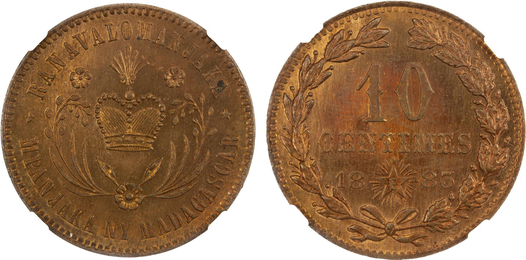 MADAGASCAR: Ranavalona III, 1883-1897, AE 10 centimes, 1883, KM-X1, Lec-5, with the letter E for "ESSAI" on star on reverse, a wonderful lustrous example! NGC graded MS64 RB. Ranavalona III was the last sovereign of the Kingdom of Madagascar. Her reign ended in ultimately futile efforts to resist the colonial designs of the government of France. She was a remarkable non-European female ruler who addressed Queen Victoria as "my dear sister." Struck by Auguste Brichaut, Brussels.