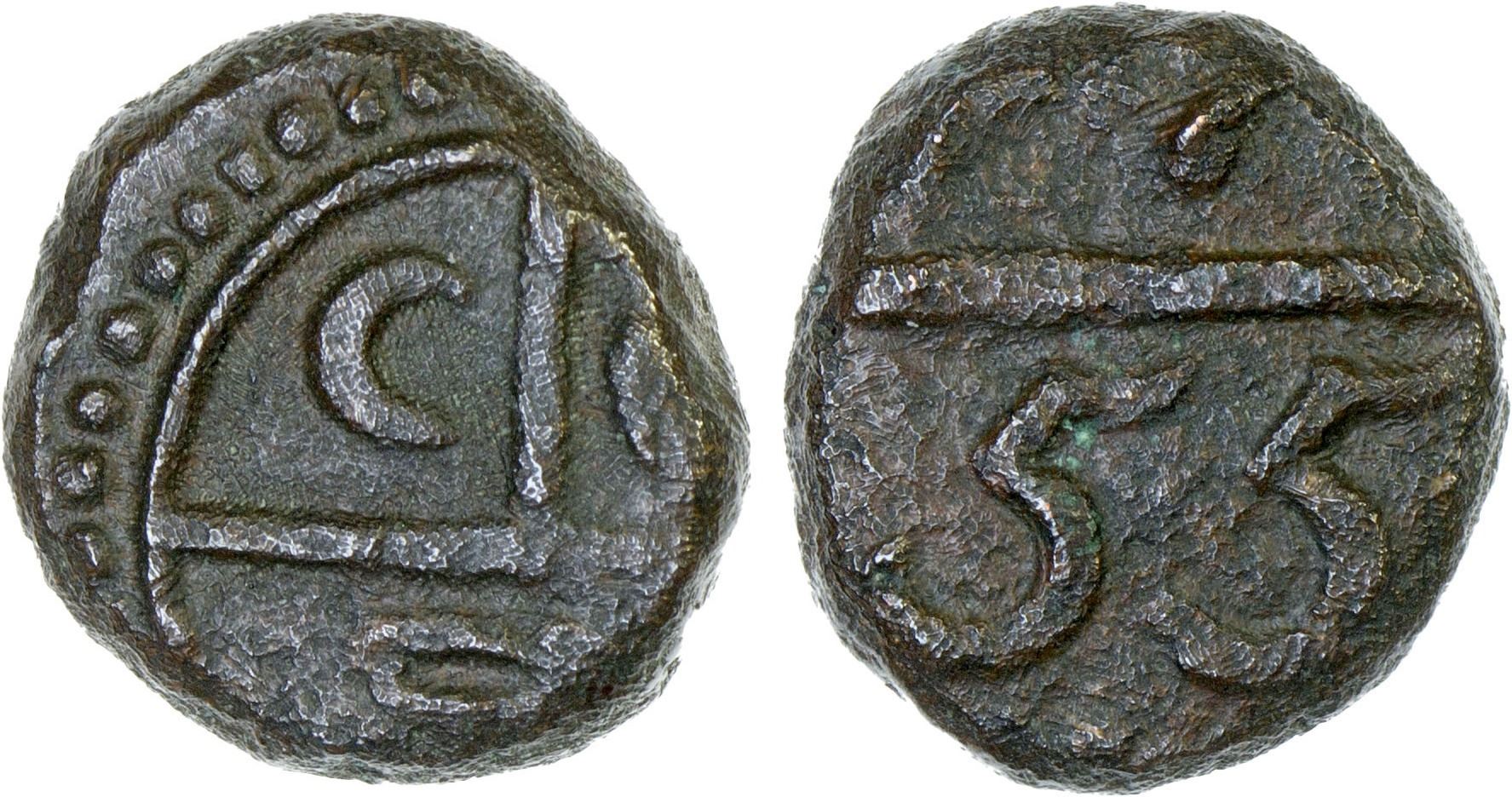 MADRAS PRESIDENCY: AE 1/2 dudu (5 cash) (2.72g), 1755, Stv-1.82, Prid-76, East India Company balemark // date in two lines; first year of the reduced weight standard; very light porosity, bold VF-XF, RR.
