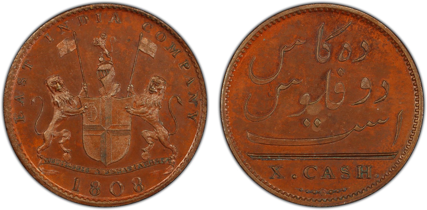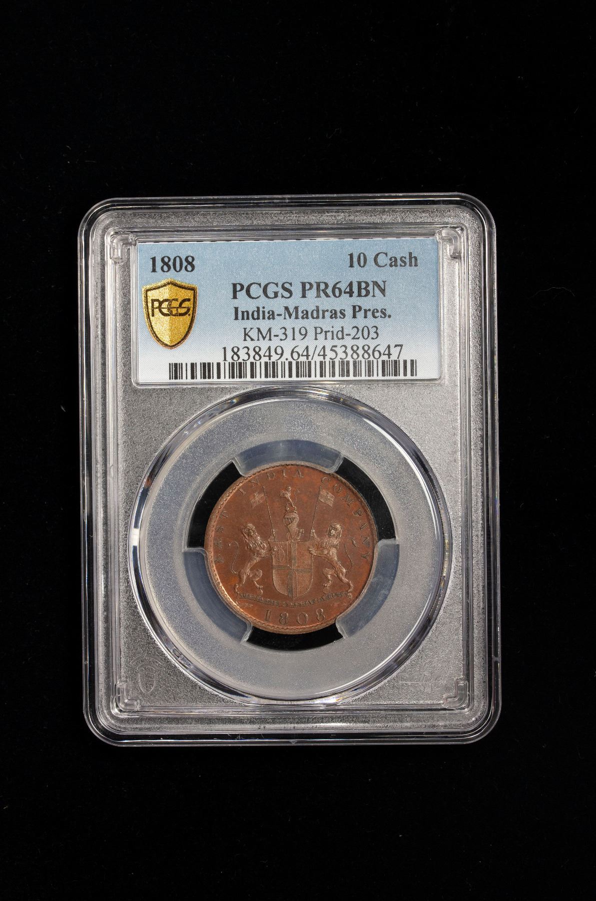 MADRAS PRESIDENCY: AE 10 cash, 1808, KM-319, Prid-203, East India Company issue, struck at the Soho Mint, Handsworth, England, a wonderful proof quality issue! PCGS graded Proof 64 BN.