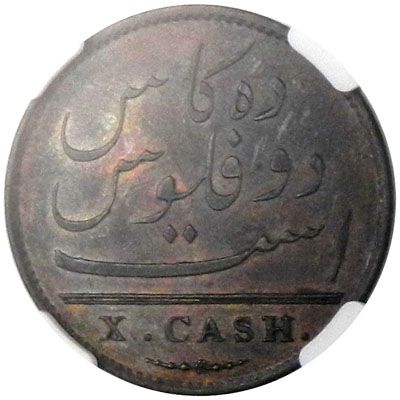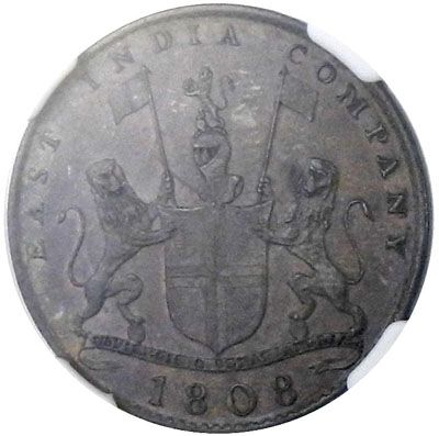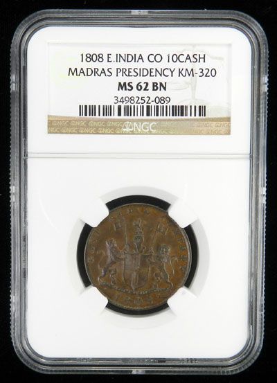 MADRAS PRESIDENCY: AE 10 cash, 1808, KM-320, NGC graded MS62 BR.