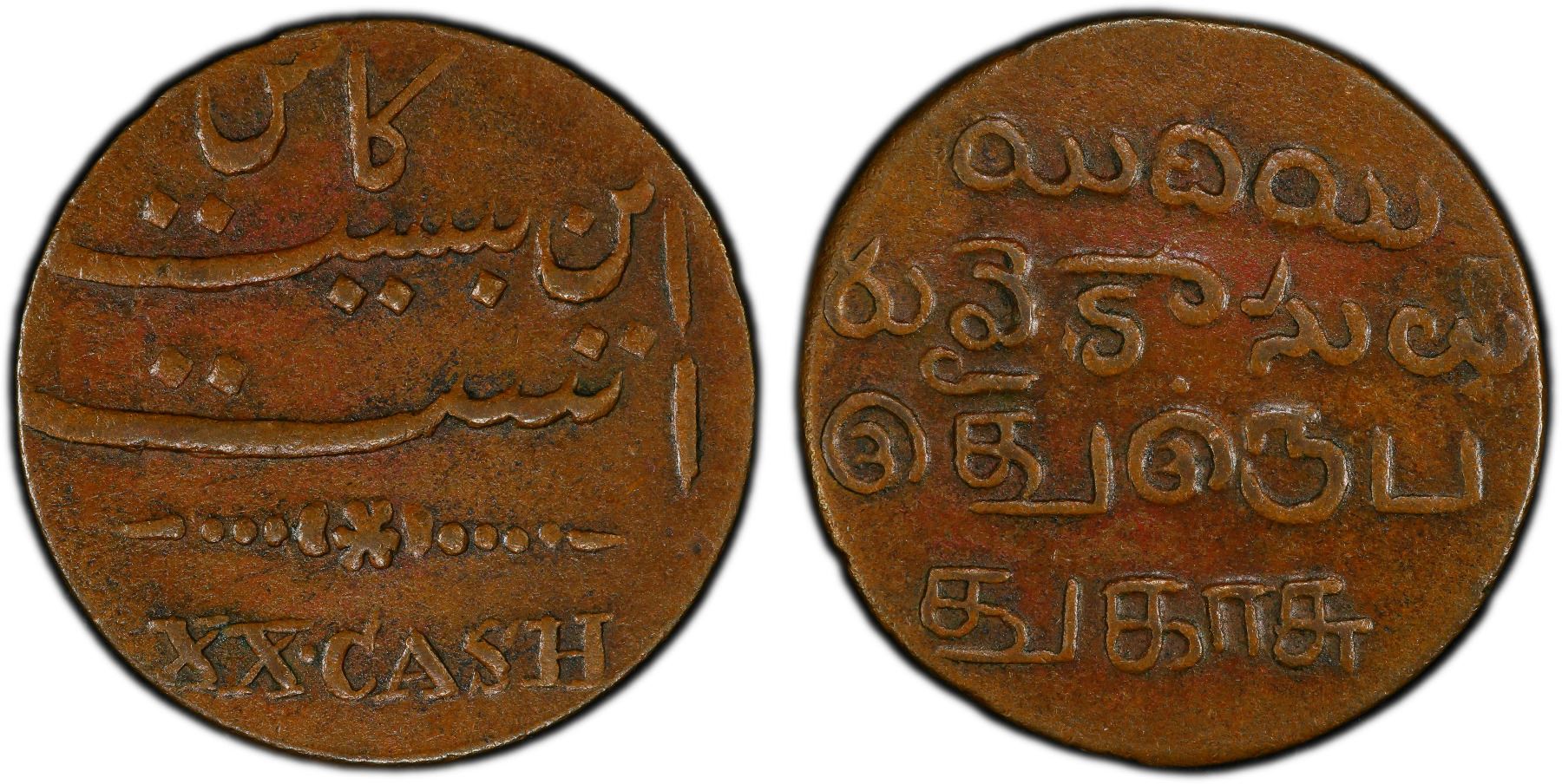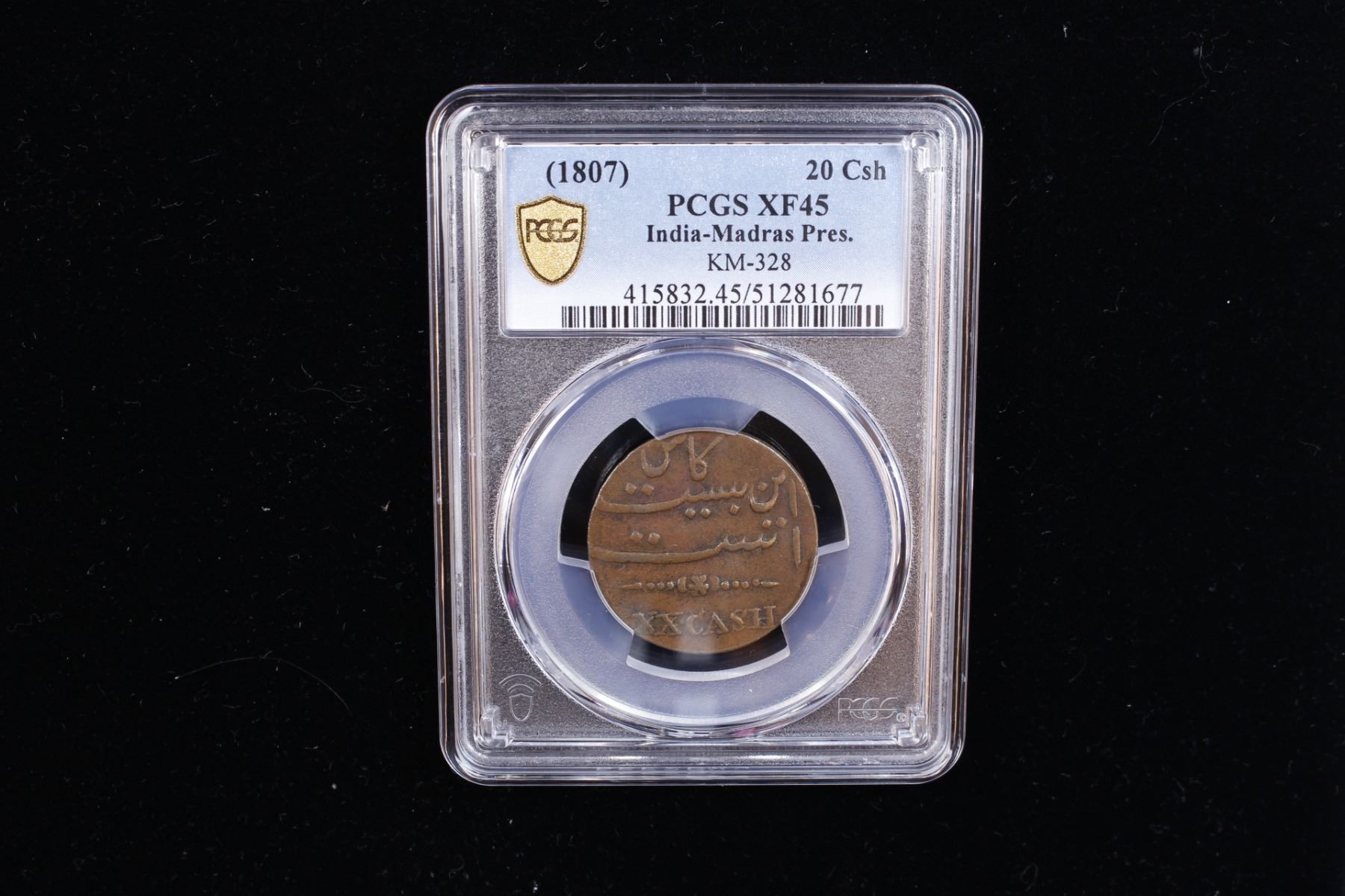 MADRAS PRESIDENCY: AE 20 cash, ND (1807), KM-328, East India Company issue, denomination in Persian and English // Tamil and Telugu, PCGS graded EF45.