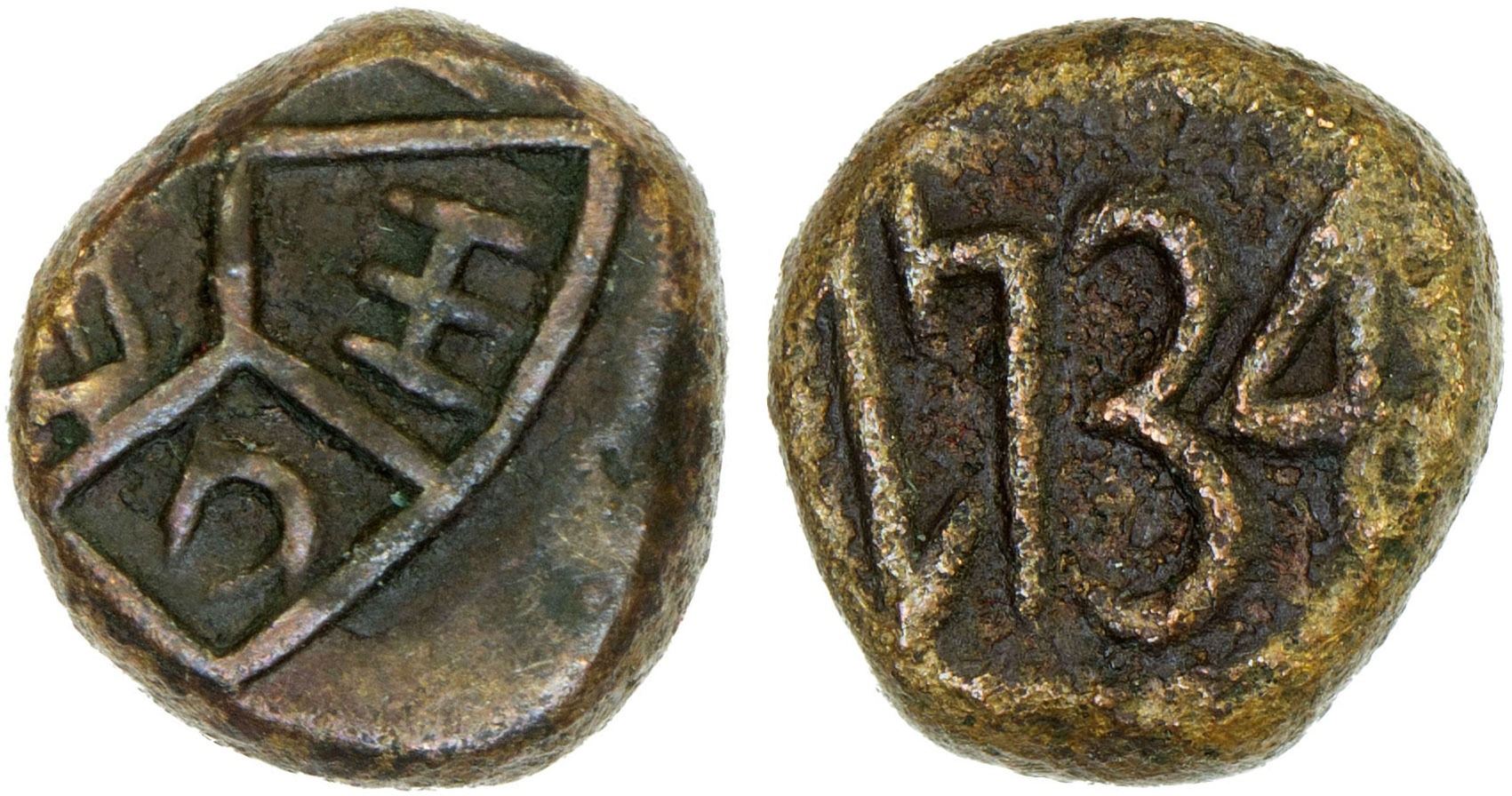 MADRAS PRESIDENCY: AE cash (1.11g), 1734, KM-302, East India Company issue with balemark, scarce date, VF. Soon after its creation, the United East India Company began to use a 'balemark', which identified its products as they arrived in busy ports or were sold on the trading floor. Initially a simple mark, this evolved by the 1700s into a heart shaped figure {denoting 'good luck') surmounted by a figure four (symbolizing Agnus Dei - 'Lamb of God') and containing the initials of the company, VEIC with the letter 'U' Latinized. This symbol became known as "the chop" a word derived from the Hindi word 'chap' – which means stamp. From the late 17th century to the early 19th century the exchange rate was; 80 cash equalling 1 fanam with 36 fanams equalling 1 pagoda.