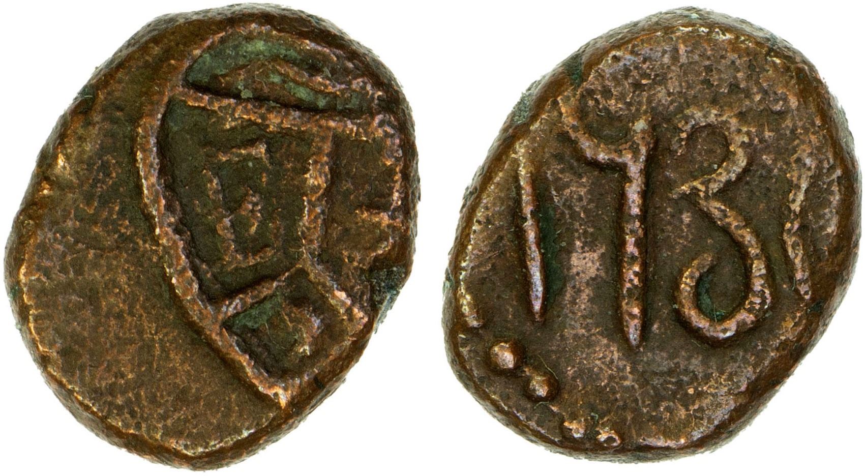 MADRAS PRESIDENCY: AE cash (1.13g), 1730, KM-302, East India Company issue with balemark, VF. Soon after its creation, the United East India Company began to use a 'balemark', which identified its products as they arrived in busy ports or were sold on the trading floor. Initially a simple mark, this evolved by the 1700s into a heart shaped figure {denoting 'good luck') surmounted by a figure four (symbolizing Agnus Dei - 'Lamb of God') and containing the initials of the company, VEIC with the letter 'U' Latinized. This symbol became known as "the chop" a word derived from the Hindi word 'chap' – which means stamp. From the late 17th century to the early 19th century the exchange rate was; 80 cash equalling 1 fanam with 36 fanams equalling 1 pagoda.