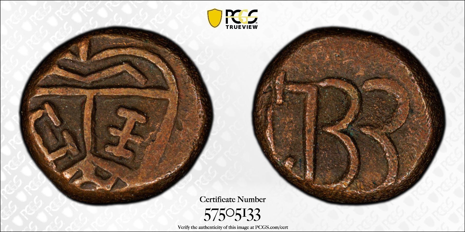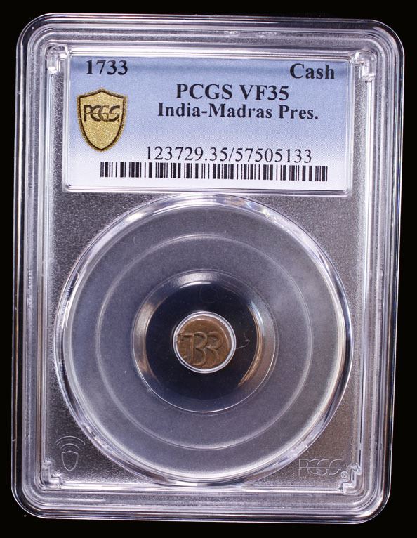 MADRAS PRESIDENCY: AE cash (1.23g), 1733, KM-302, East India Company issue, balemark on reverse, PCGS graded VF35. Soon after its creation, the United East India Company began to use a balemark, which identified its products as they arrived in busy ports or were sold on the trading floor. Initially a simple mark, this evolved by the 1700s into a heart shaped figure (denoting good luck) surmounted by a figure 4 (symbolizing Agnus Dei - 'Lamb of God') and containing the initials of the company, VEIC, with the letter U Latinized. This symbol became known as "the chop", a word derived from the Hindi word 'chap', which means stamp. From the late 17th century to the early 19th century the exchange rate was 80 cash equaling 1 fanam, with 36 fanams equaling 1 pagoda.