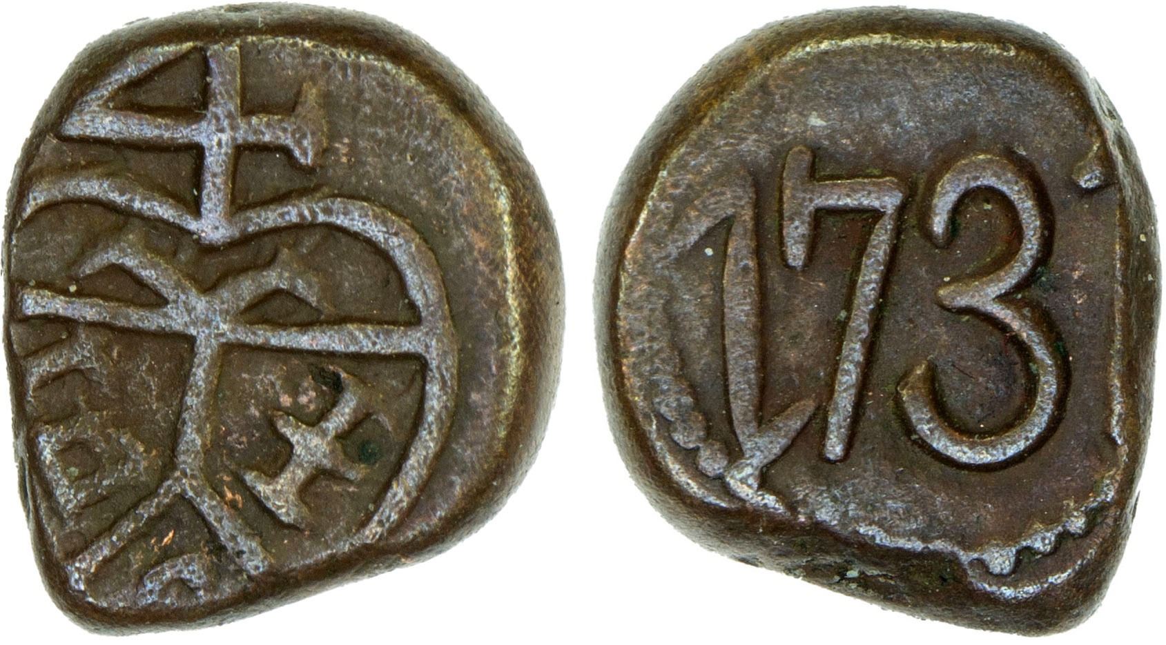 MADRAS PRESIDENCY: AE cash (1.25g), 1731, KM-302, East India Company issue with balemark, VF. Soon after its creation, the United East India Company began to use a 'balemark', which identified its products as they arrived in busy ports or were sold on the trading floor. Initially a simple mark, this evolved by the 1700s into a heart shaped figure {denoting 'good luck') surmounted by a figure four (symbolizing Agnus Dei - 'Lamb of God') and containing the initials of the company, VEIC with the letter 'U' Latinized. This symbol became known as "the chop" a word derived from the Hindi word 'chap' – which means stamp. From the late 17th century to the early 19th century the exchange rate was; 80 cash equalling 1 fanam with 36 fanams equalling 1 pagoda.