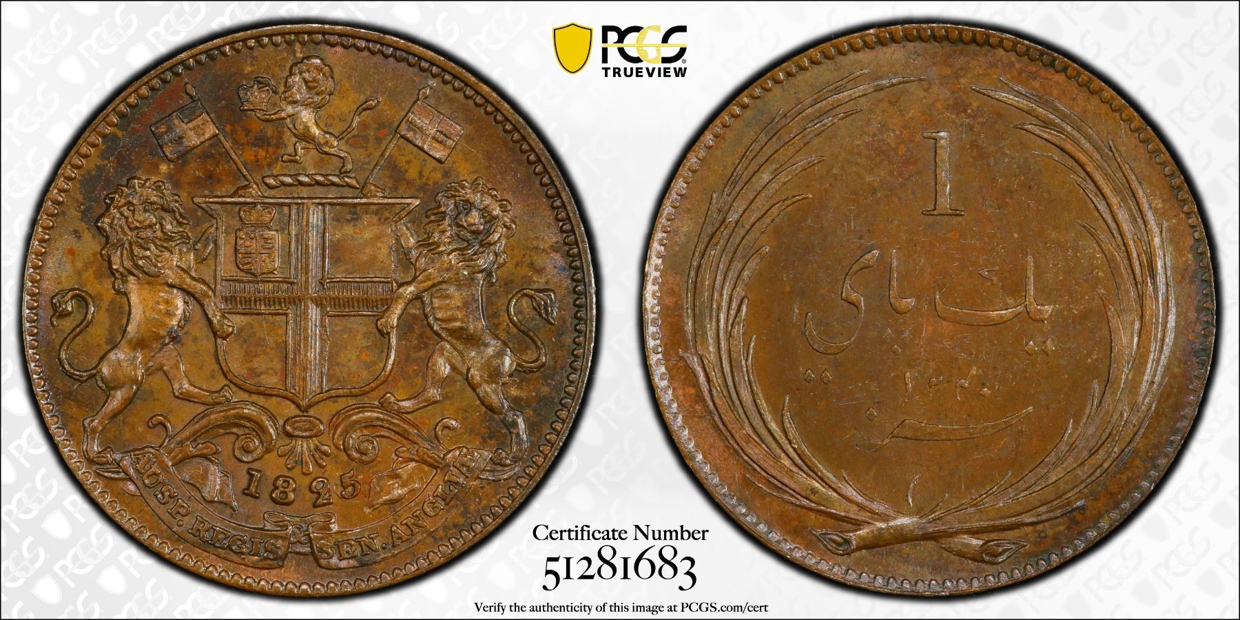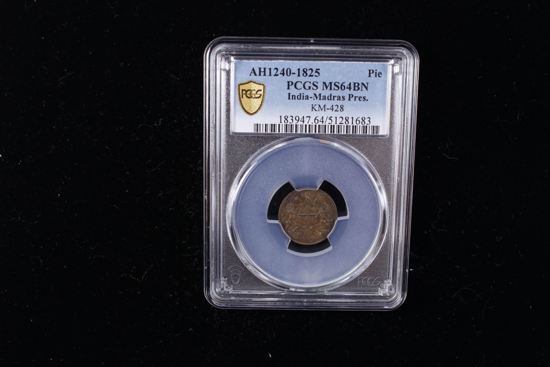 MADRAS PRESIDENCY: AE pie, 1825/AH1240, KM-428, Stv-5.97. Prid-284, East India Company issue, a wonderful quality mint state example! PCGS graded MS64 BN.