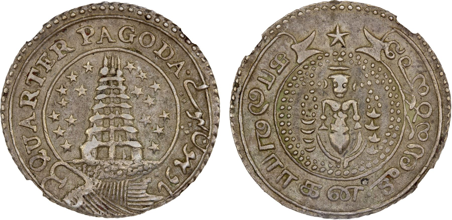 MADRAS PRESIDENCY: AR 1/4 pagoda, ND (1808-1812), KM-352, East India Company issue, Vishnu holding sword // legend in English and Persian on buckled garter belt surrounding a seven tiered temple gopuram (ornate tower), NGC graded AU50