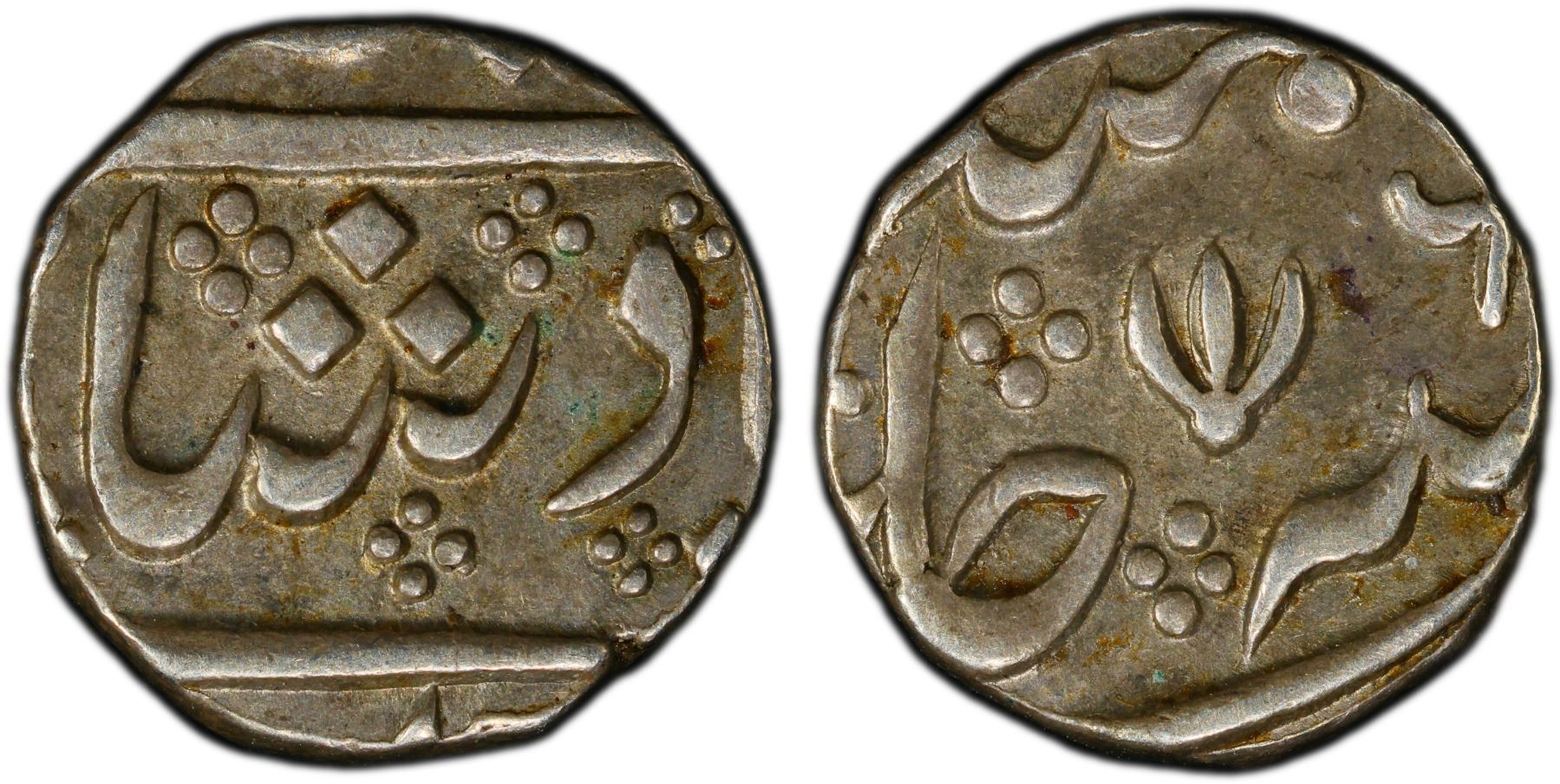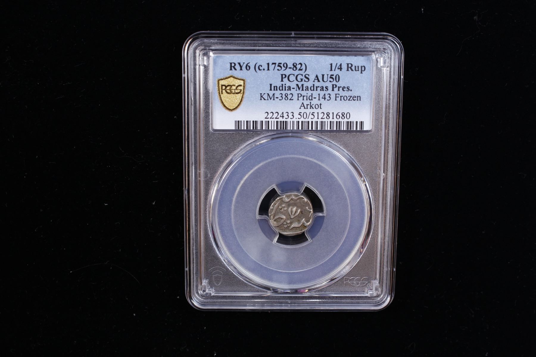 MADRAS PRESIDENCY: AR 1/4 rupee (2.87g), Arcot, year 6, KM-382, Stv-2.65. Prid-143, East India Company issue in the name of the Mughal Emperor Alamgir II, struck with frozen date, PCGS graded AU50. Tied with one other example (from the Solar Collection) for finest graded at PCGS (Top Pop).